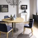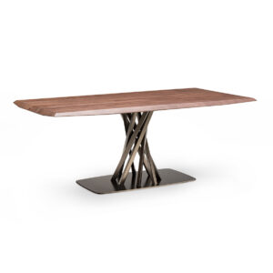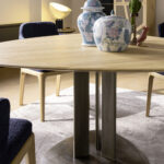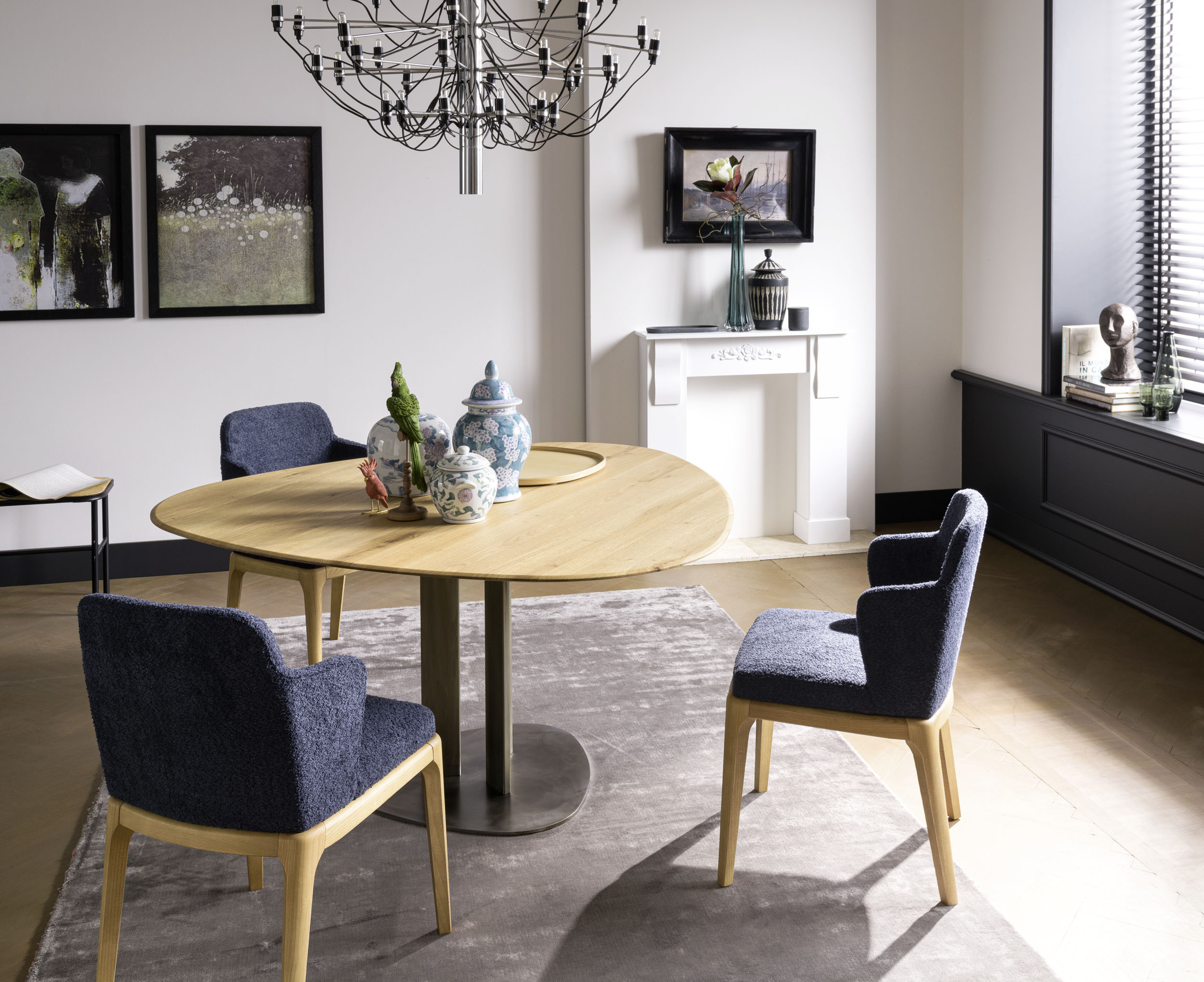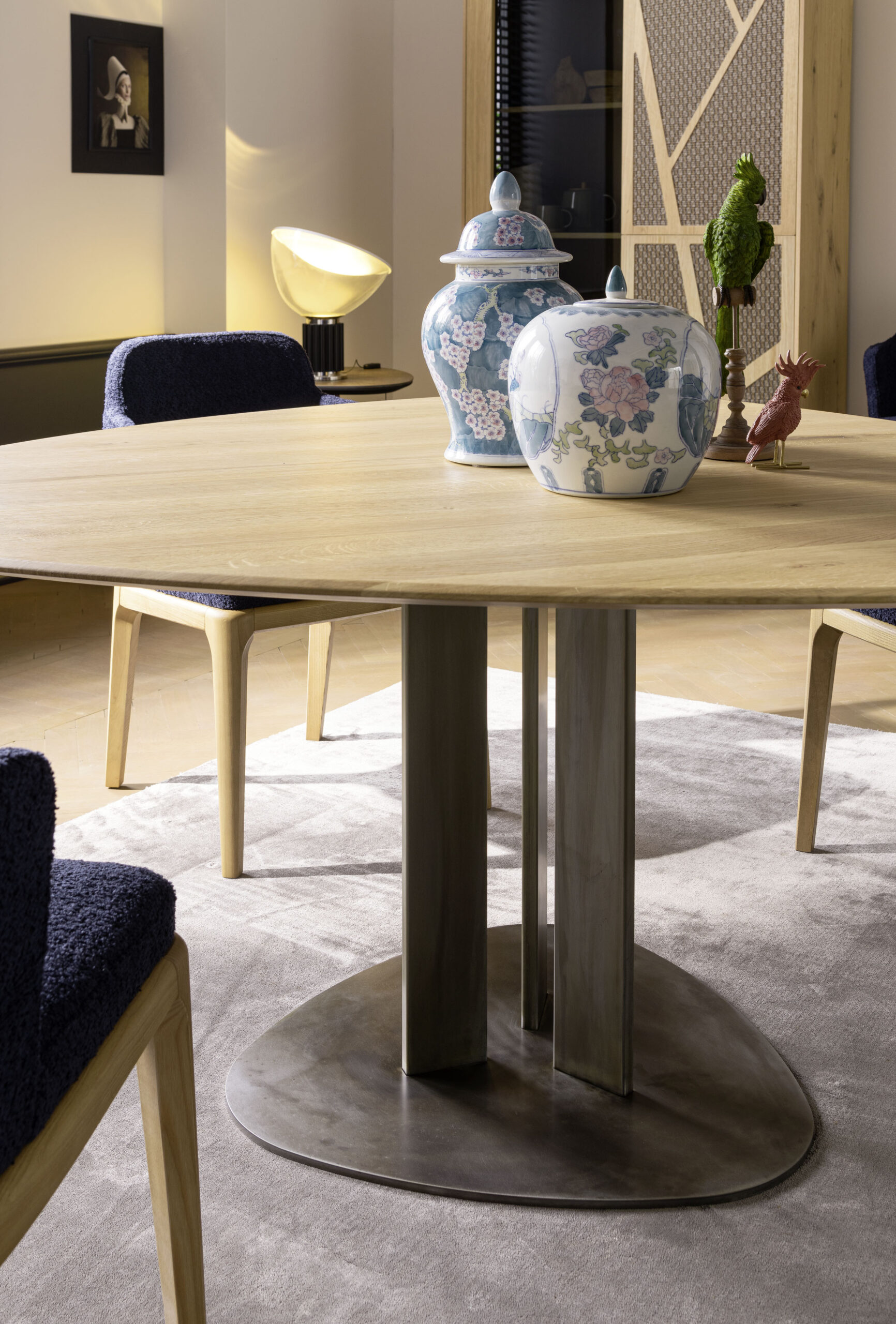 Tops in solid oak, 30 mm thick, brushed surface. Base in powder-coated or oxidized steel with acrylic finish.