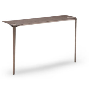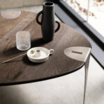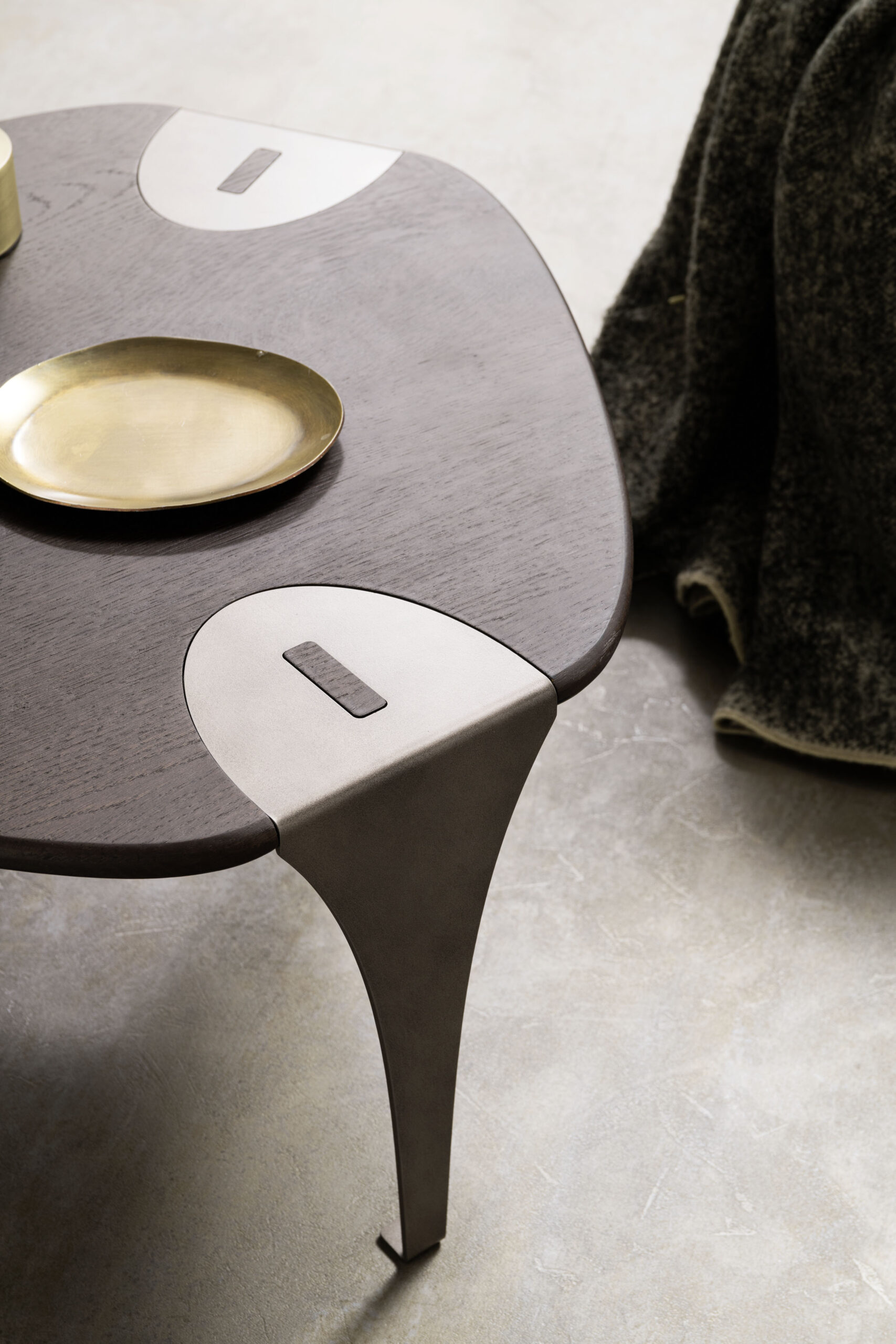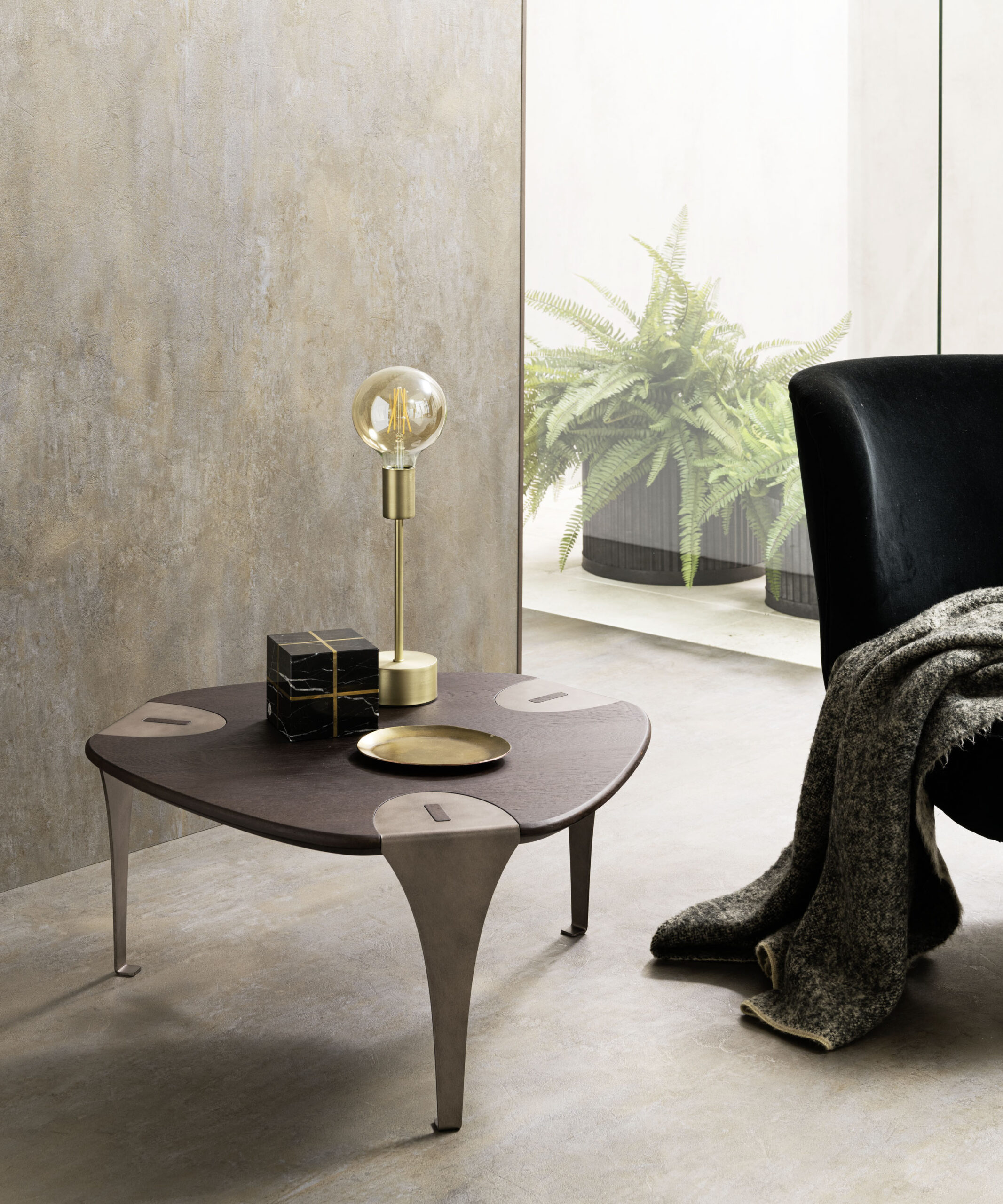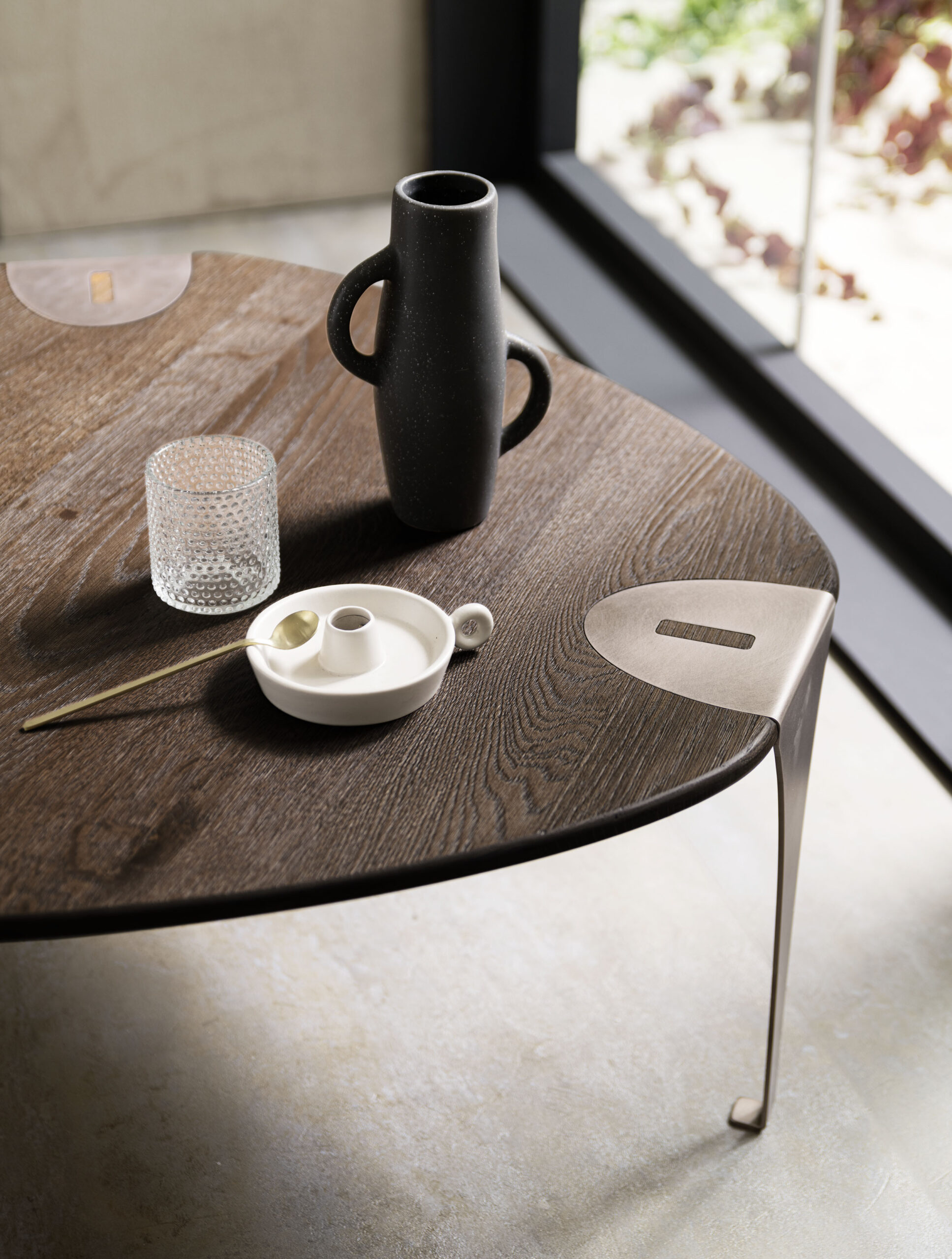 Tops in 30 mm thick solid oak with brushed surface or solid unbrushed canaletto walnut. Water-based vinyl glues, two-component acrylic paints. Base in powder-coated or oxidized steel with acrylic finish.