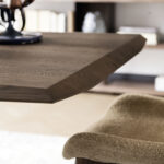 Tops in solid oak, 40 mm thick, brushed surface, in canaletto walnut or ceramic. Base in powder-coated steel with acrylic finish.