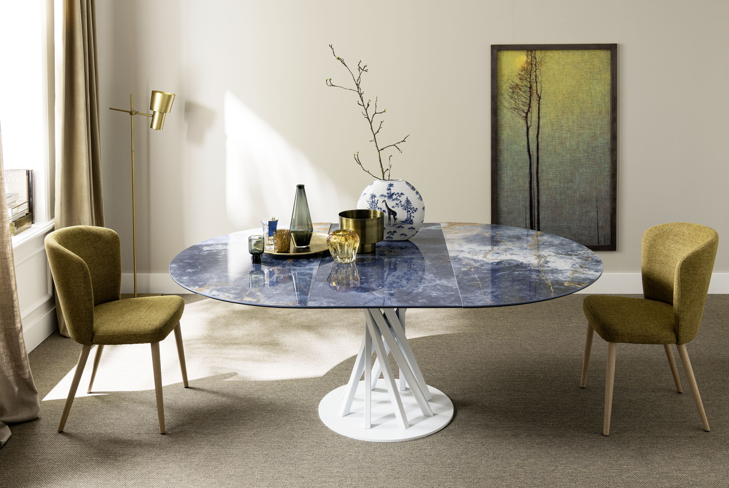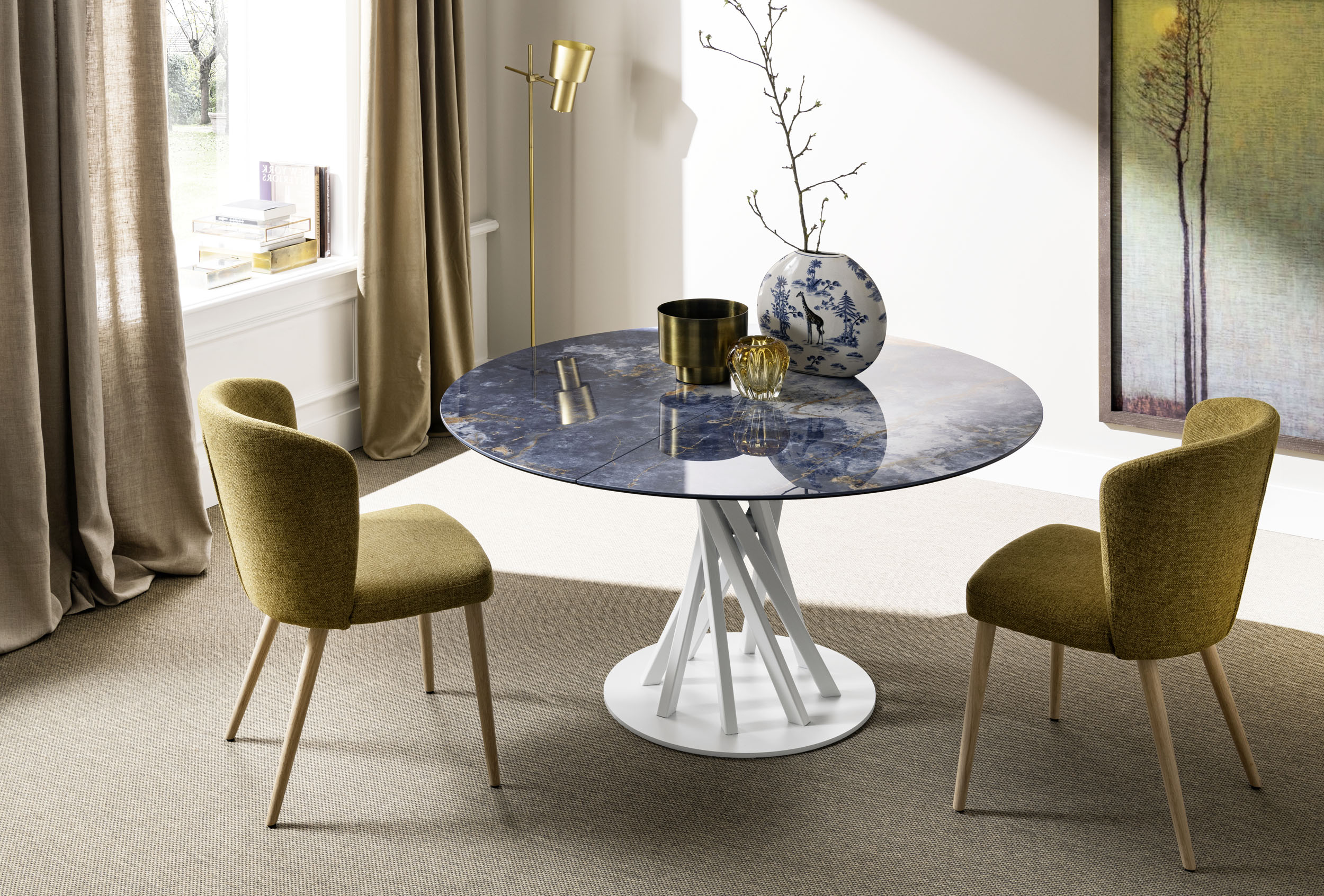 Tops in 20 mm thick oak with brushed surface, in canaletto walnut or ceramic coupled with glass. Base in powder-coated steel with acrylic finish.