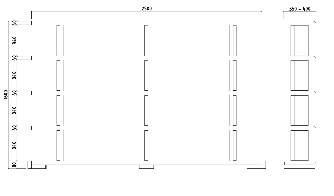 Structural clamps in iron, shelves in solid durmast wood 40-mm thick.