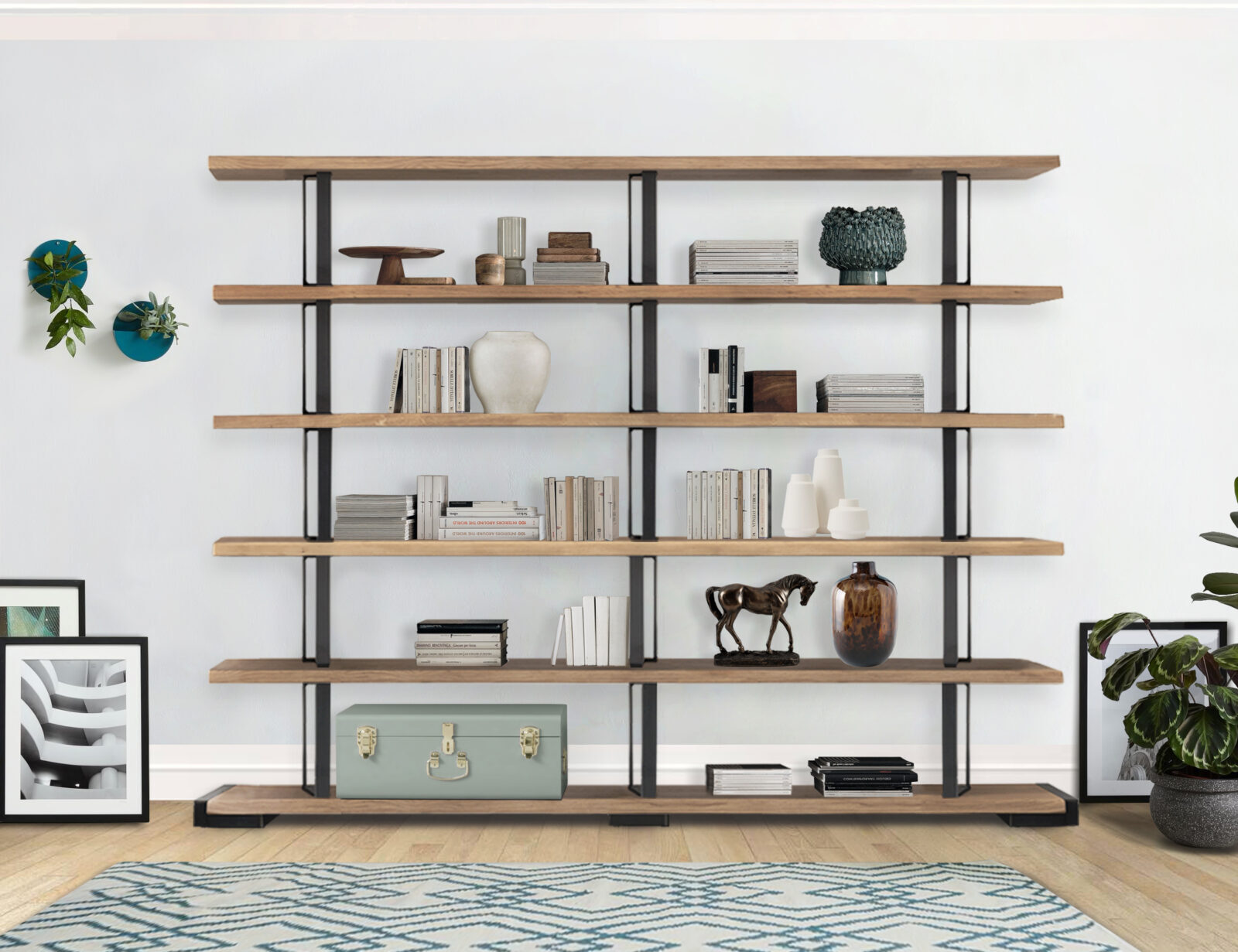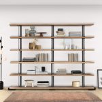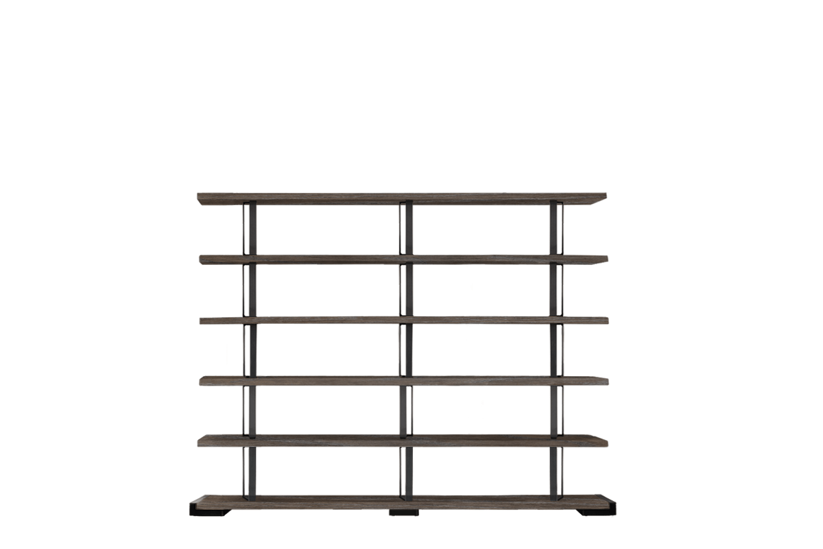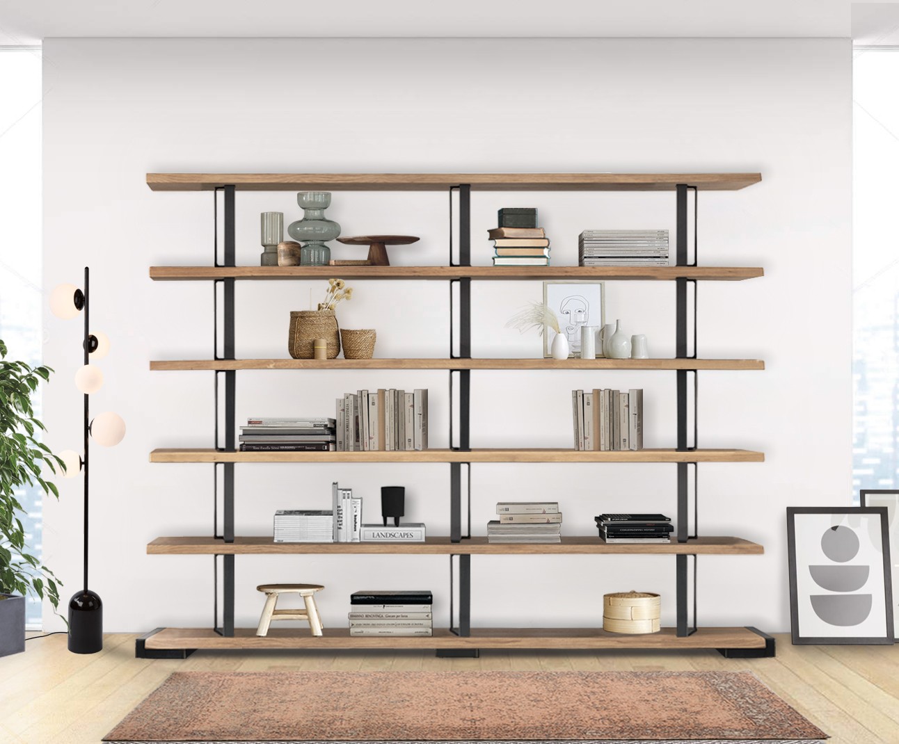 Fixed scheme bookcase in solid durmast wood with uneven edges and structural iron clamps with an industrial chic design. Can’t you find the right combination for you? At our authorized sellers you will be able to personalize it according to your needs.