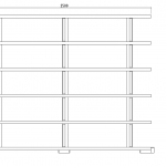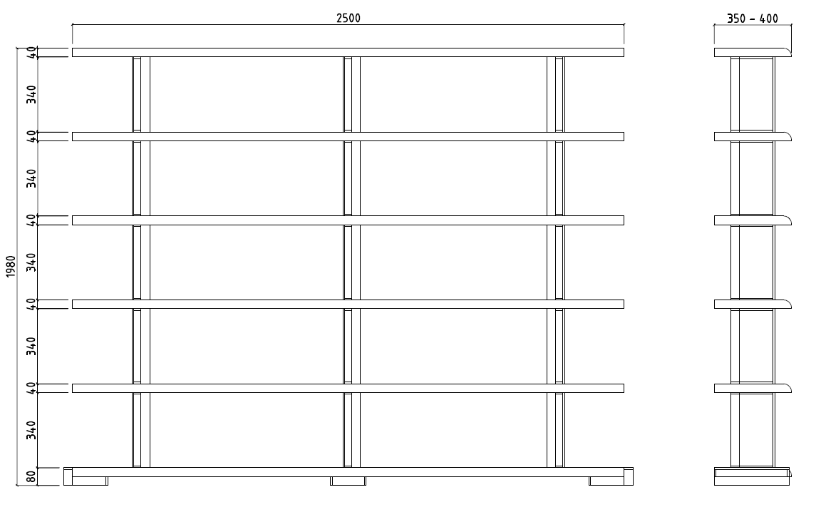 Structural clamps in iron, shelves in solid durmast wood 40-mm thick.