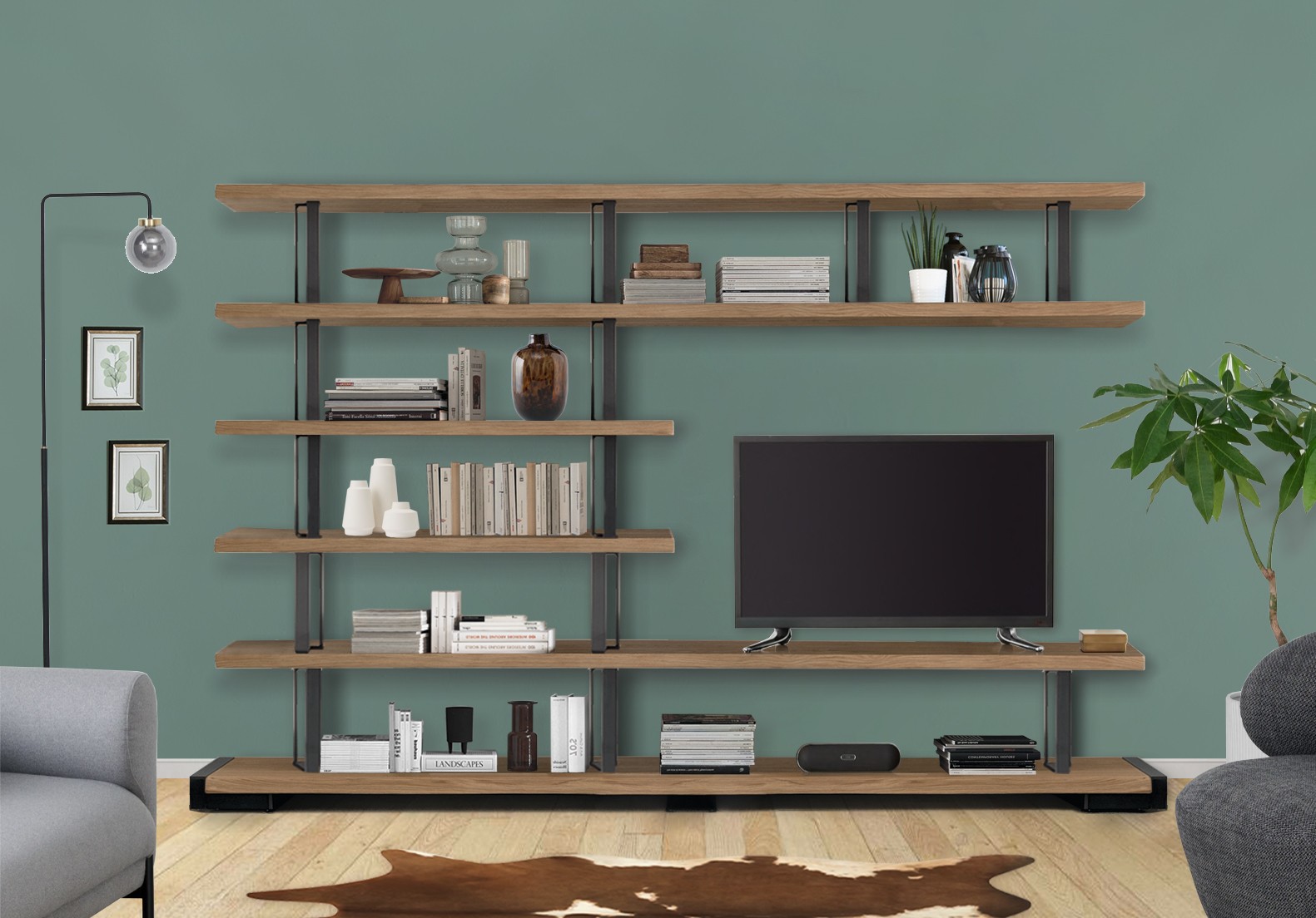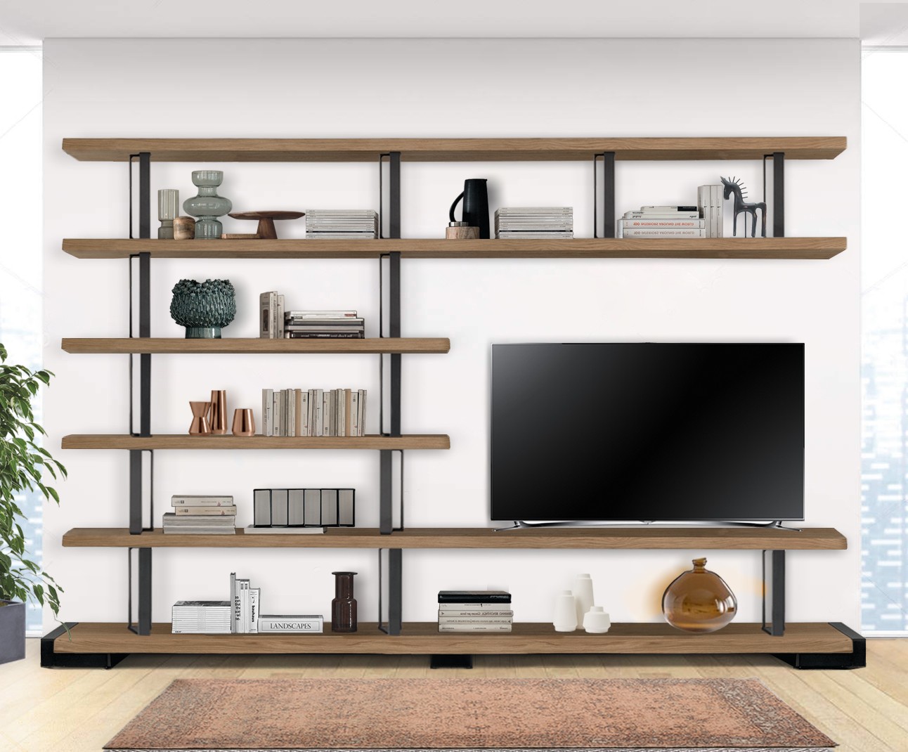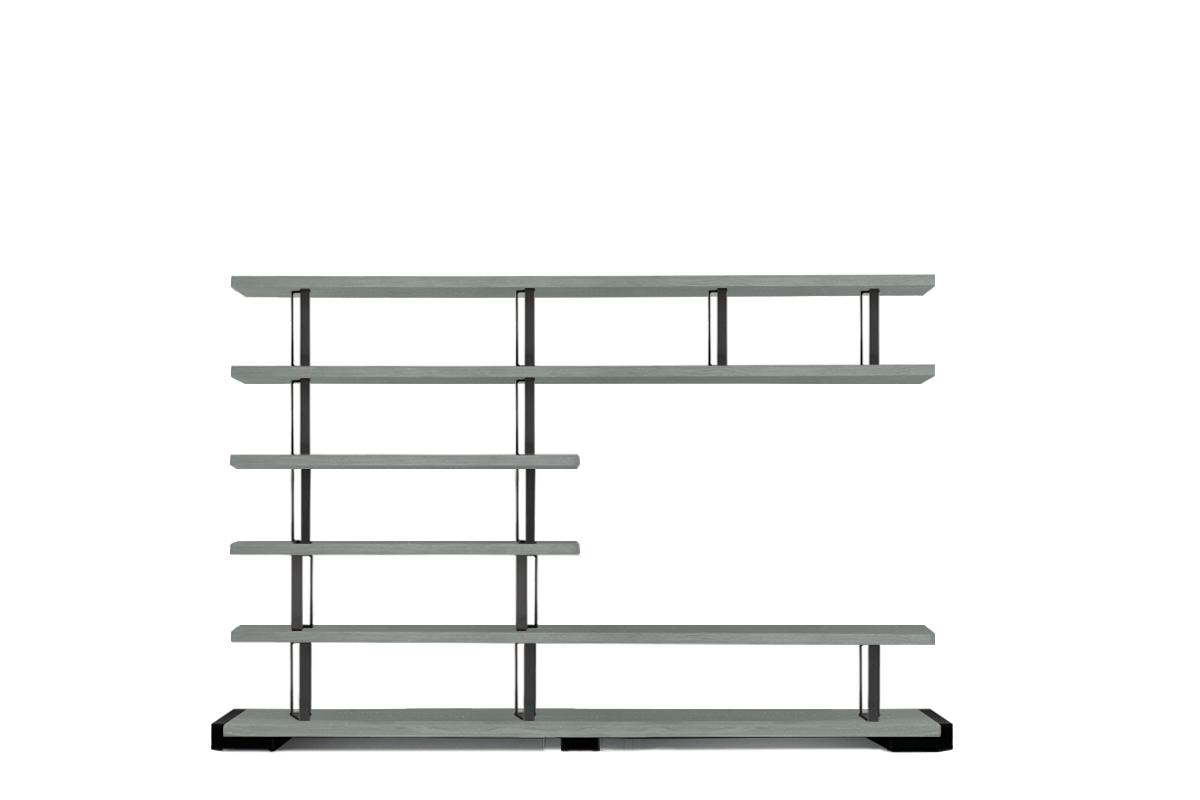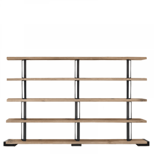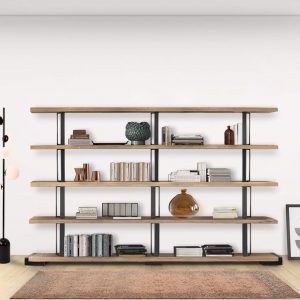 Fixed scheme bookcase in solid durmast wood with uneven edges and structural iron clamps with an industrial chic design. Can’t you find the right combination for you? At our authorized sellers you will be able to personalize it according to your needs.