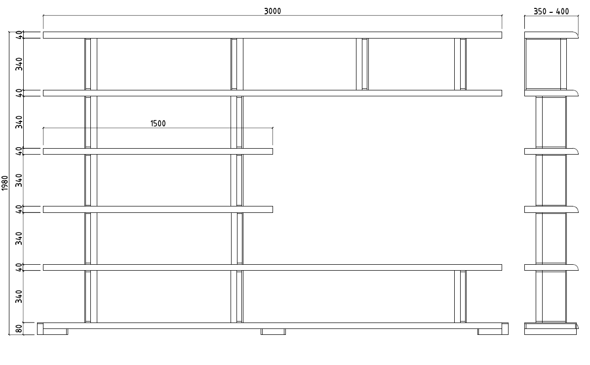 Structural clamps in iron, shelves in solid durmast wood 40-mm thick.
