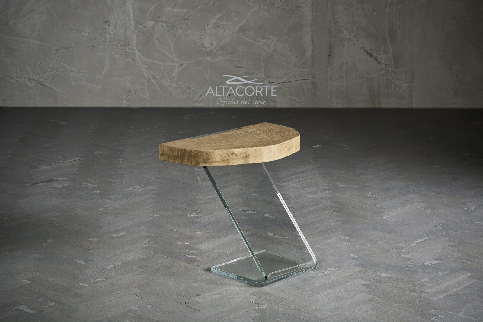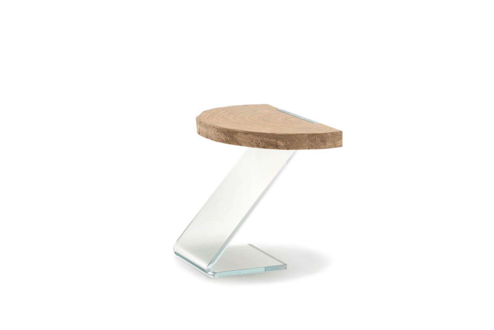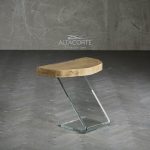 MATERIAL: 60-mm thick solid oak wood top. 19-mm thick, extralight, hot-curved glass base. Non-tempered. Water based vinyl adhesives or two-component acryl coat.