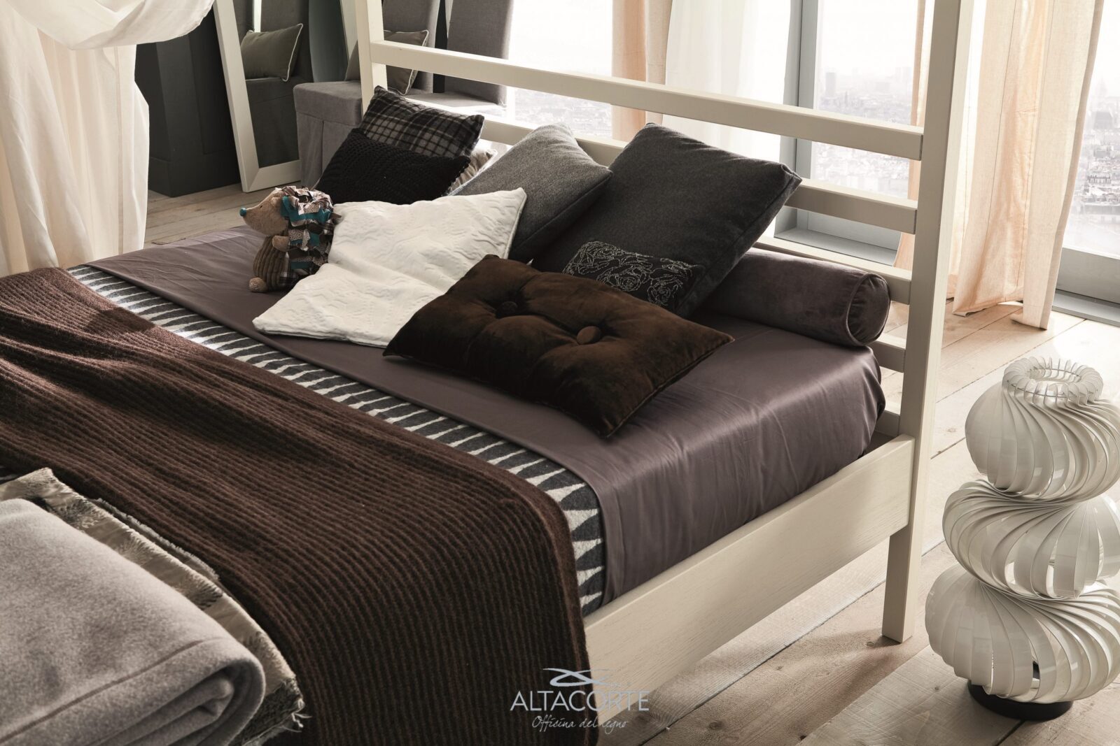 The structure of the headboard, side rails, legs and footboard are made of solid European oak. Water-based vinyl glues and ureic resins complying with UNI-CEE standards are used.