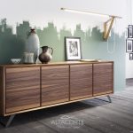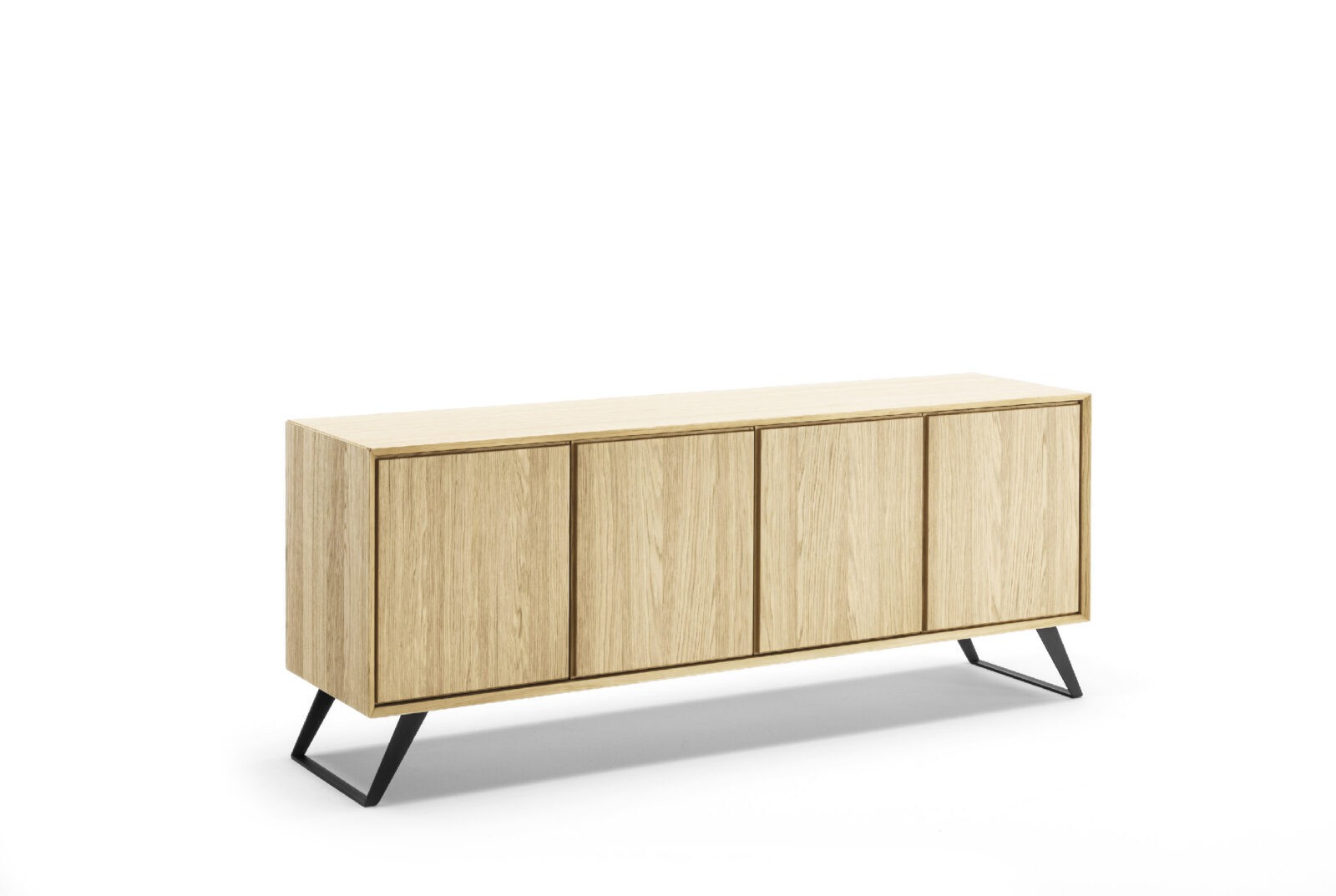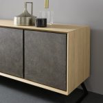 Sideboard entirely realized in durmast or walnut wood with brushed external surface. Vinyl adhesives and water-based ureic resins comply with the UNI-EEC regulations. Water based vinyl adhesives or two-component acryl coat. Solid durmast wood table base or in epoxy-painted or acrylic-finish oxidised steel.