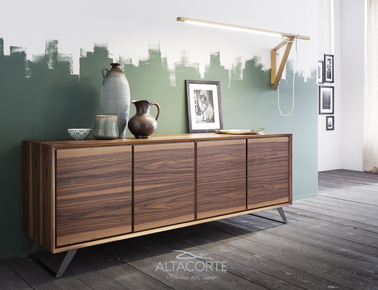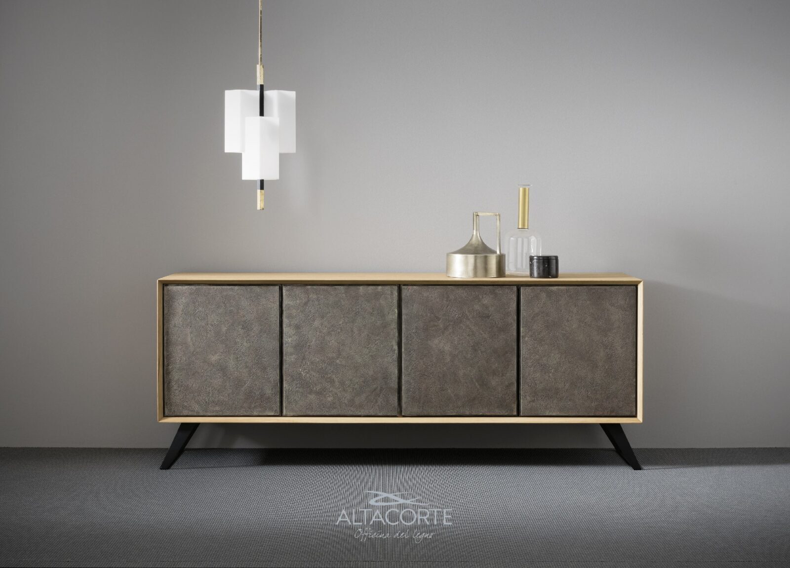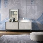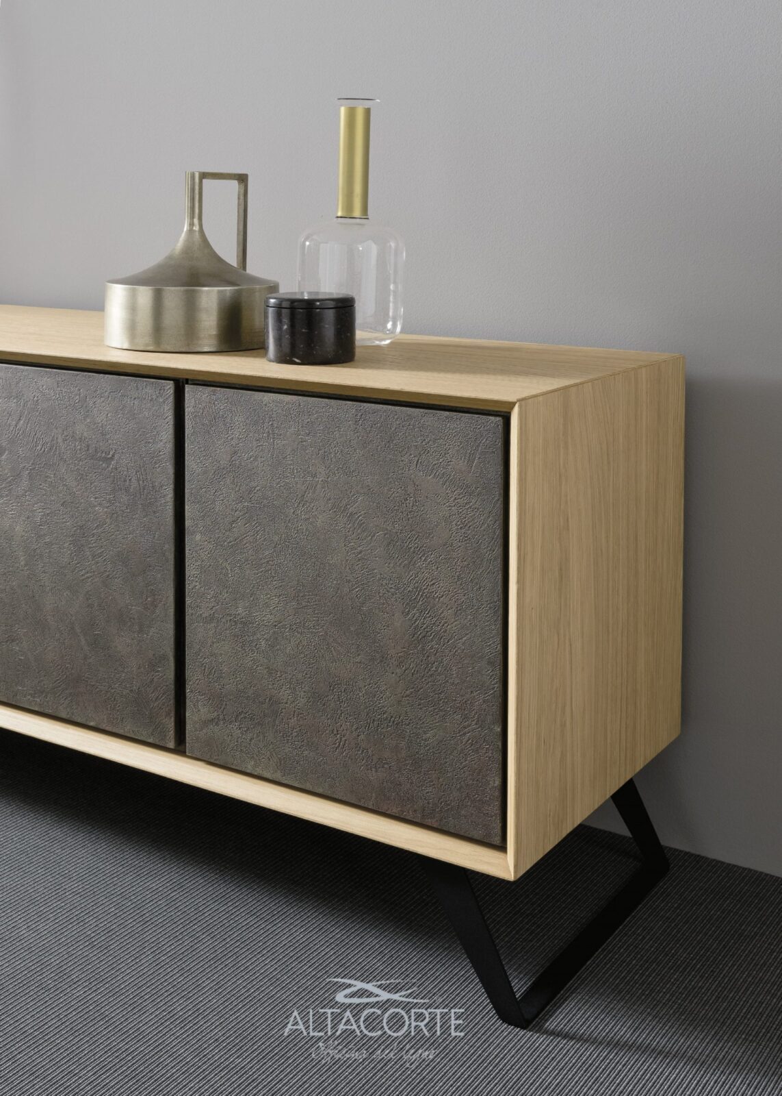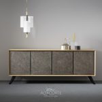 A classic of the Altacorte style. A sideboard with cabinet entirely realized in durmast or walnut wood, created by skilled hands of expert artisans. An essential design, but never trivial, which could be further enriched by the peculiar cement doors.