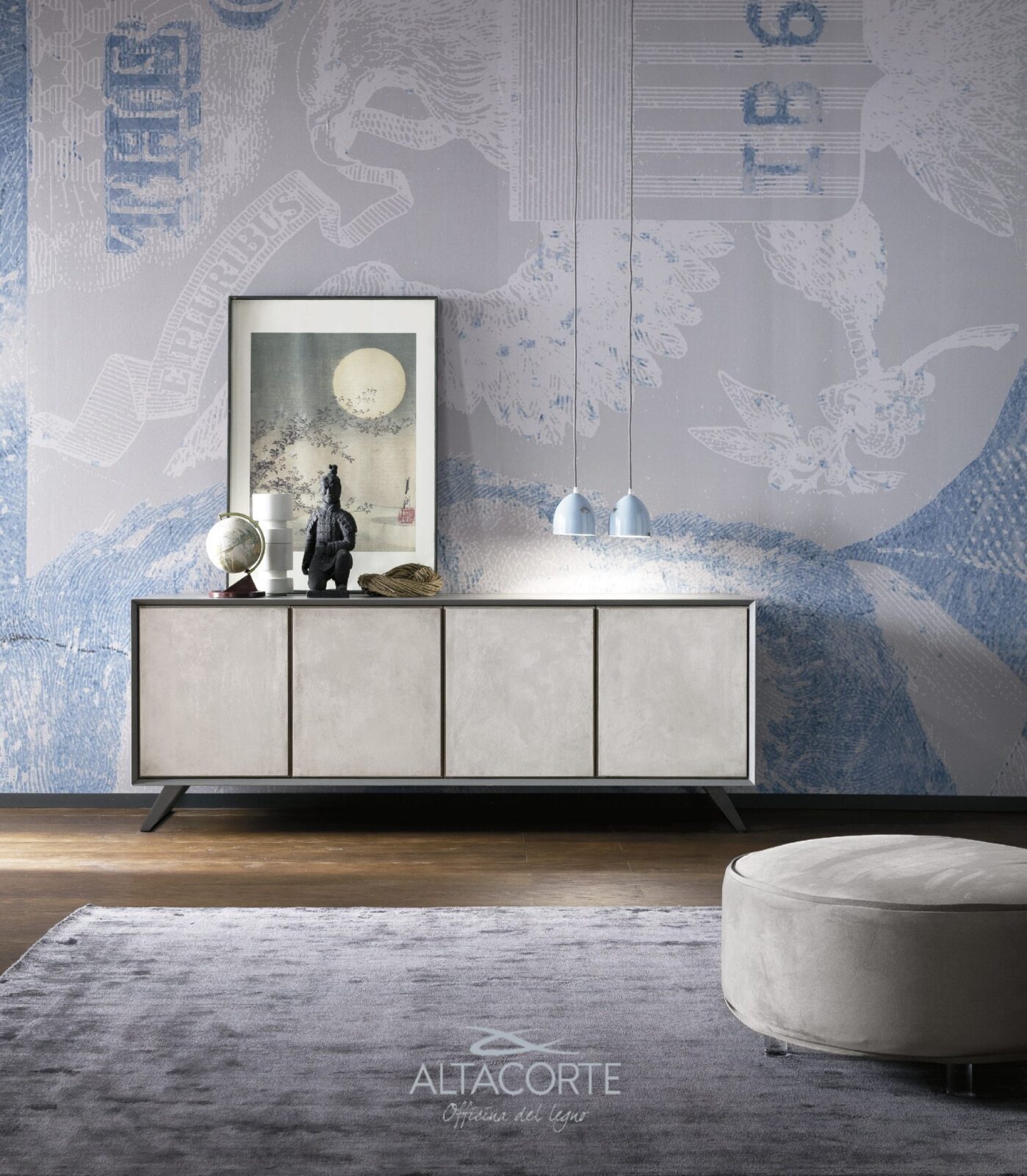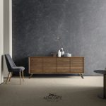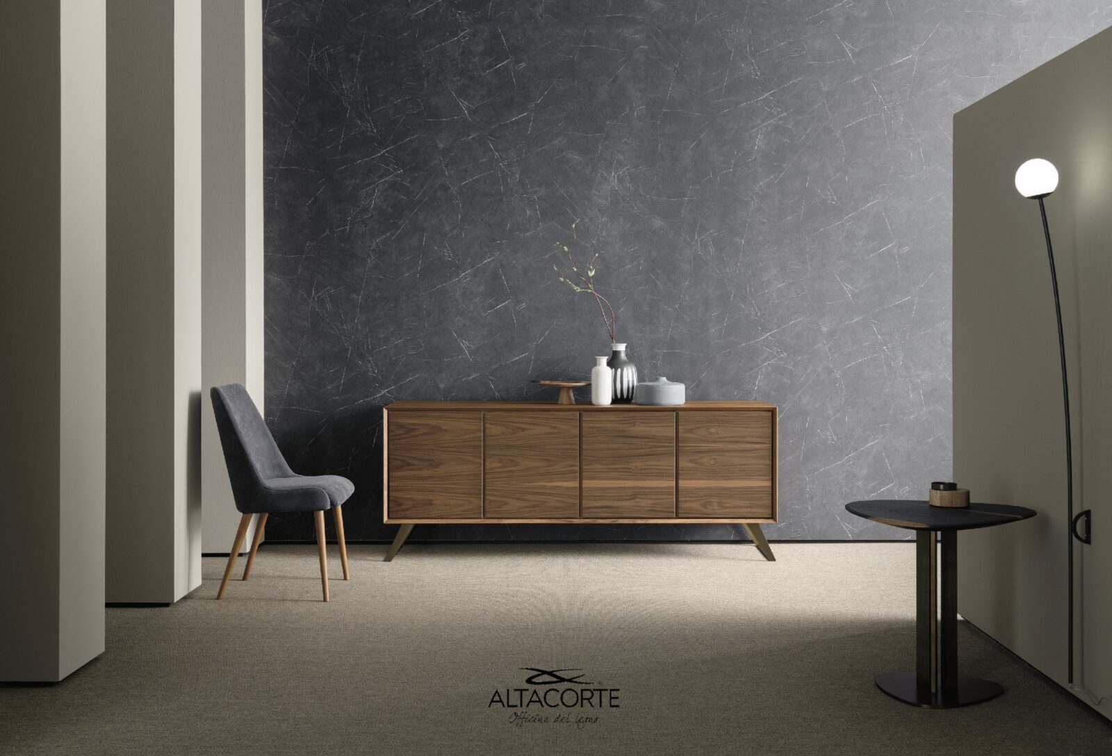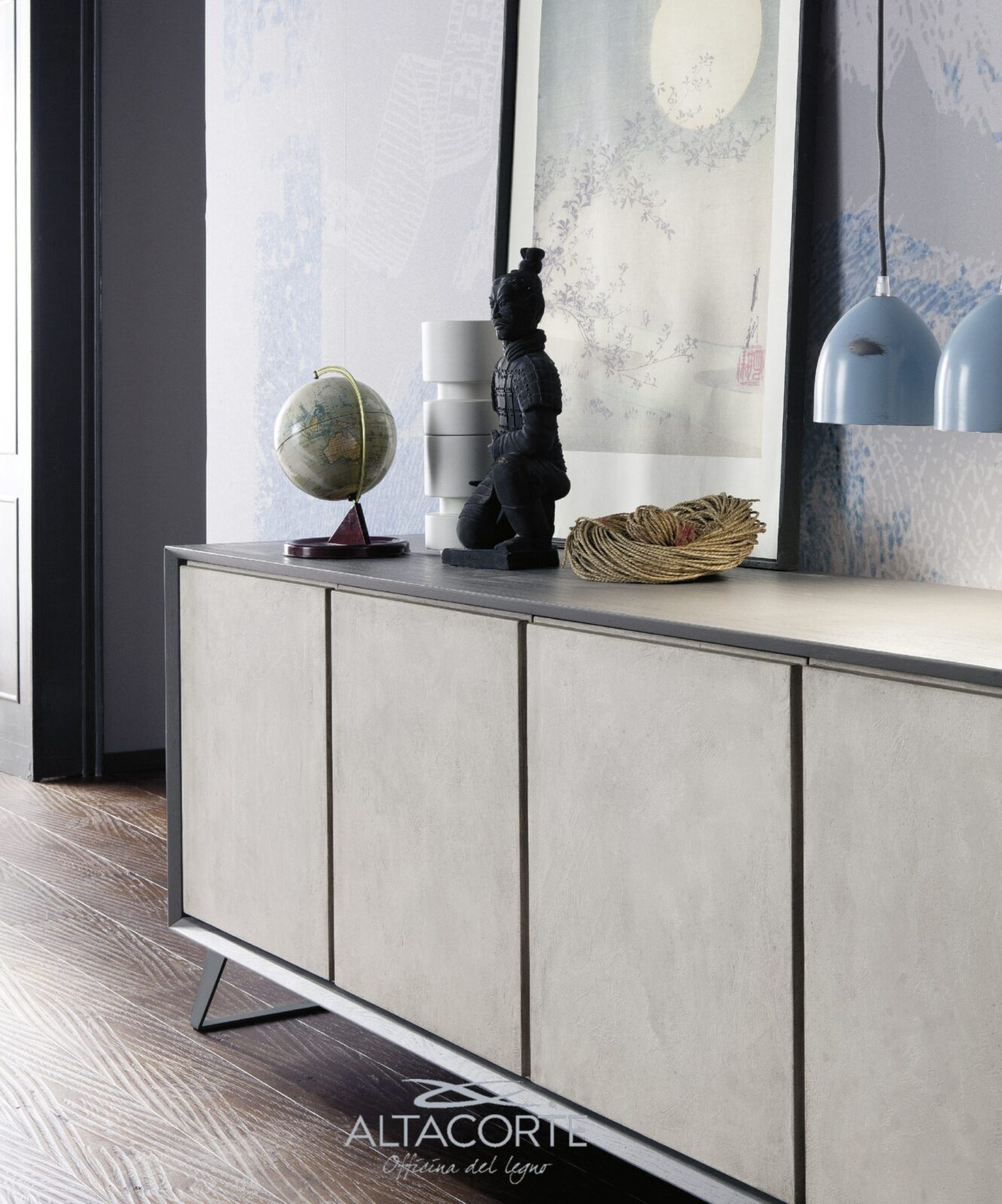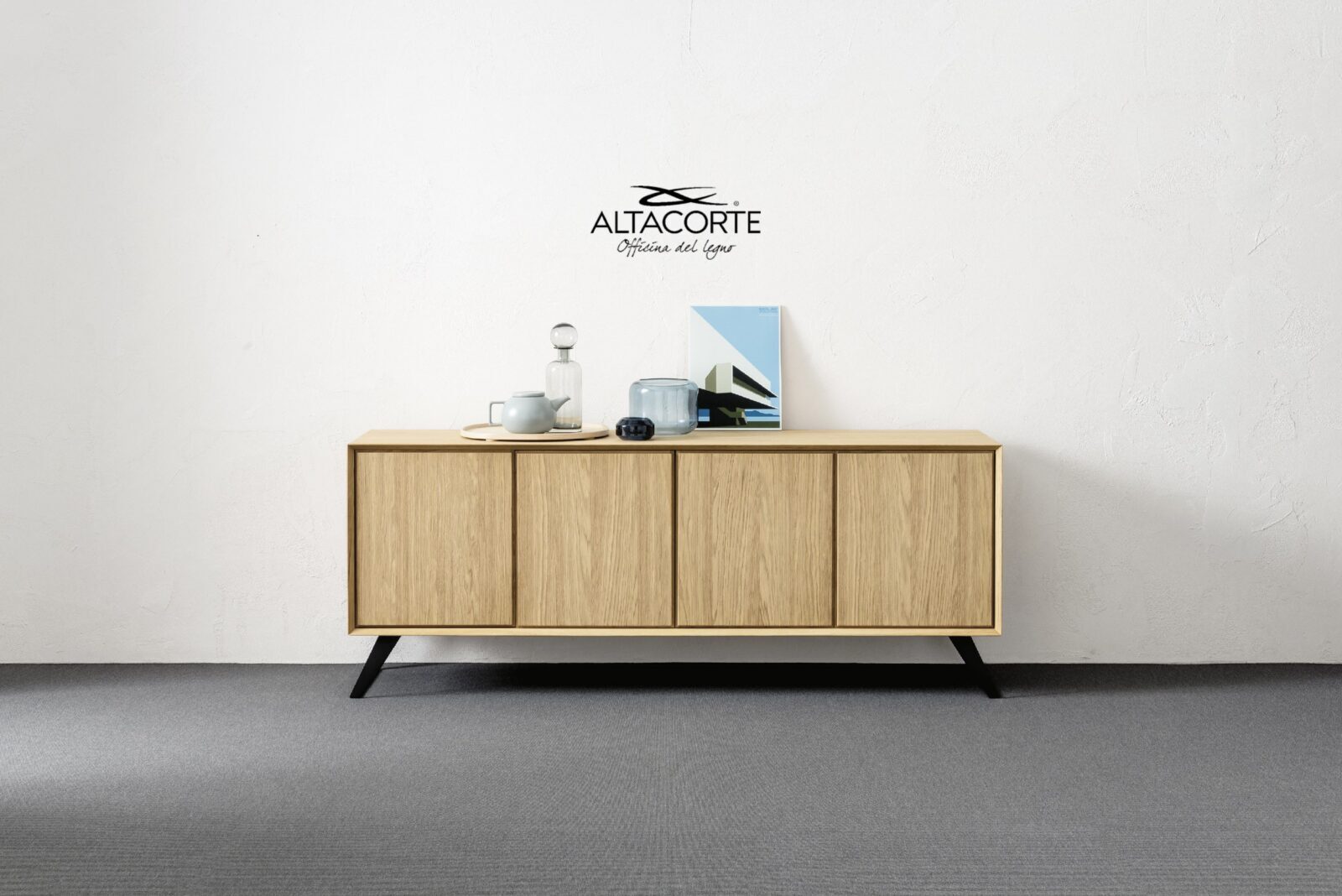 A classic of the Altacorte style. A sideboard with cabinet entirely realized in durmast or walnut wood, created by skilled hands of expert artisans. An essential design, but never trivial, which could be further enriched by the peculiar cement doors.