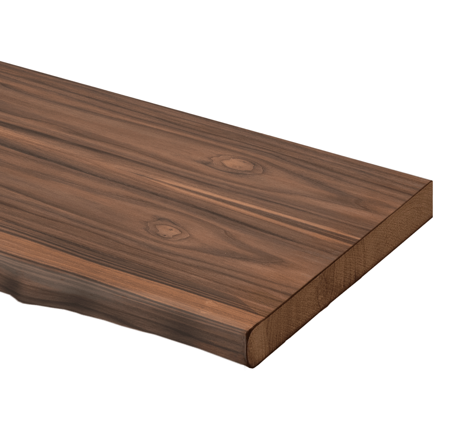 Solid European Canaletto walnut wood tops 40/45-mm thick with uneven long edges or four straight edges. Both the natural shape of the tree trunk and its natural colour variations are preserved. Water based vinyl adhesives or two-component acryl coat.
