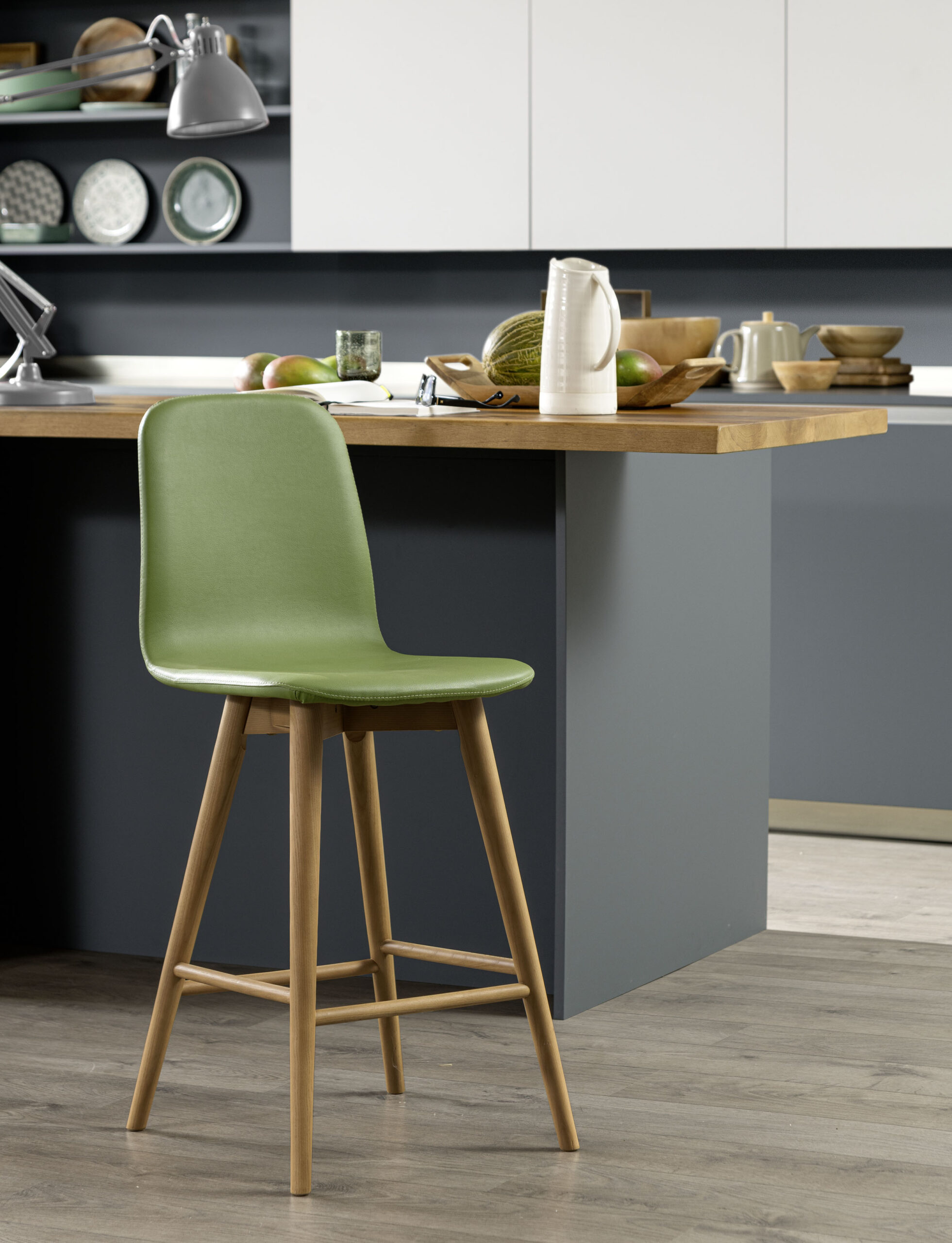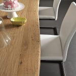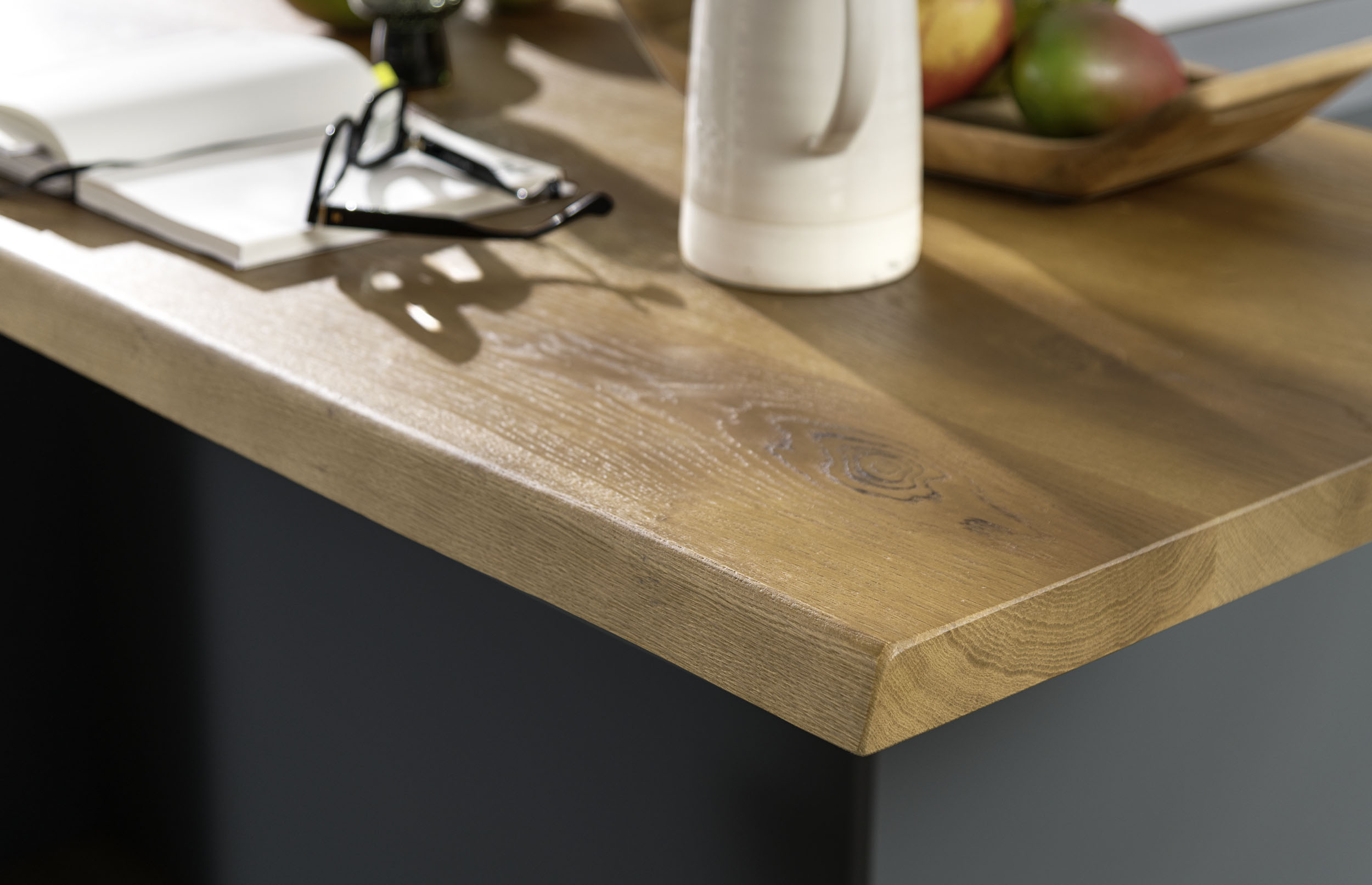 European solid durmast wood tops 40/45-mm thick with uneven long edges or four straight edges. Both the natural shape of the tree trunk and its natural colour variations are preserved. Water based vinyl adhesives or two-component acryl coat.