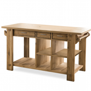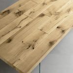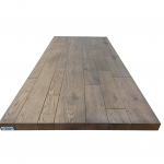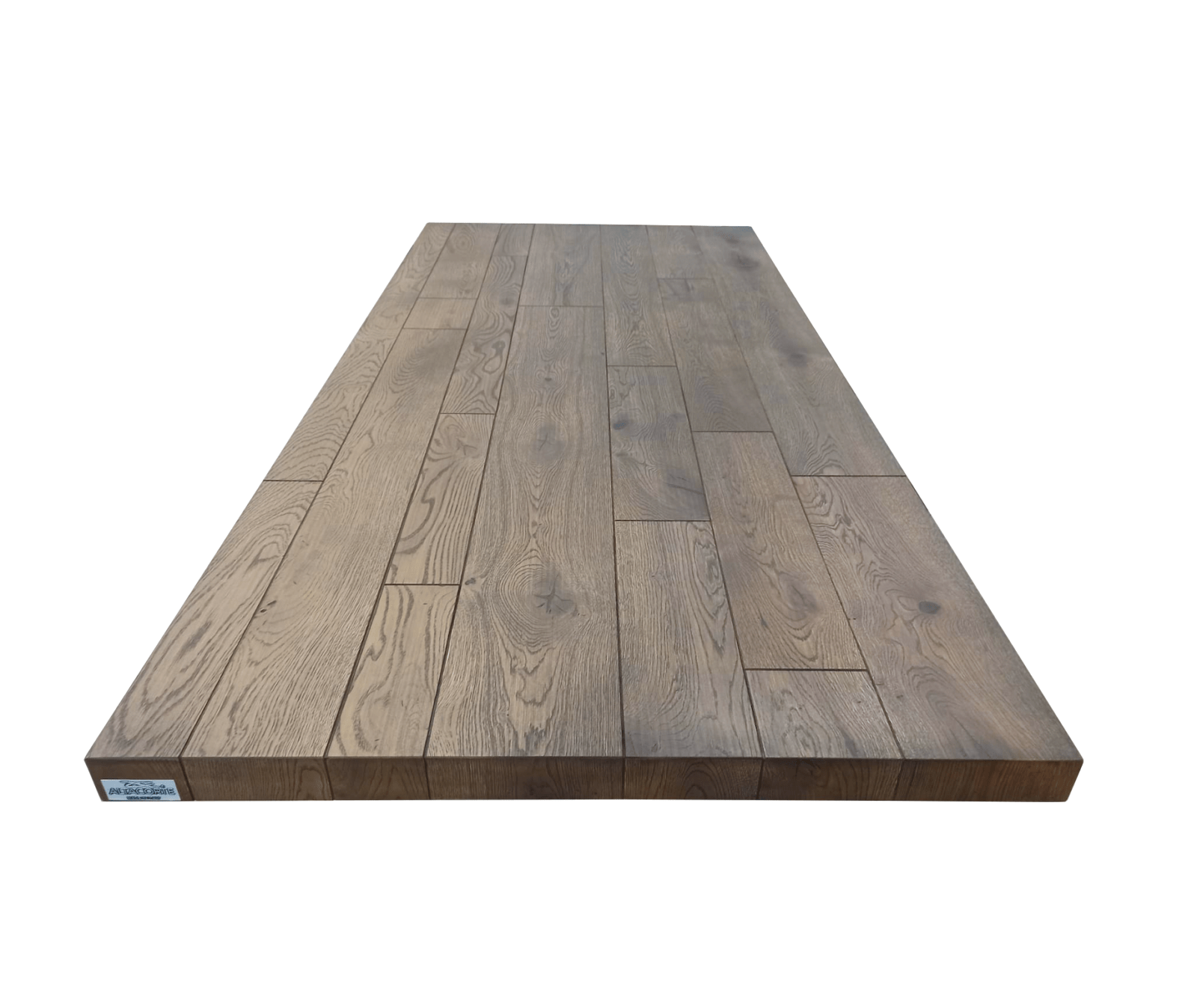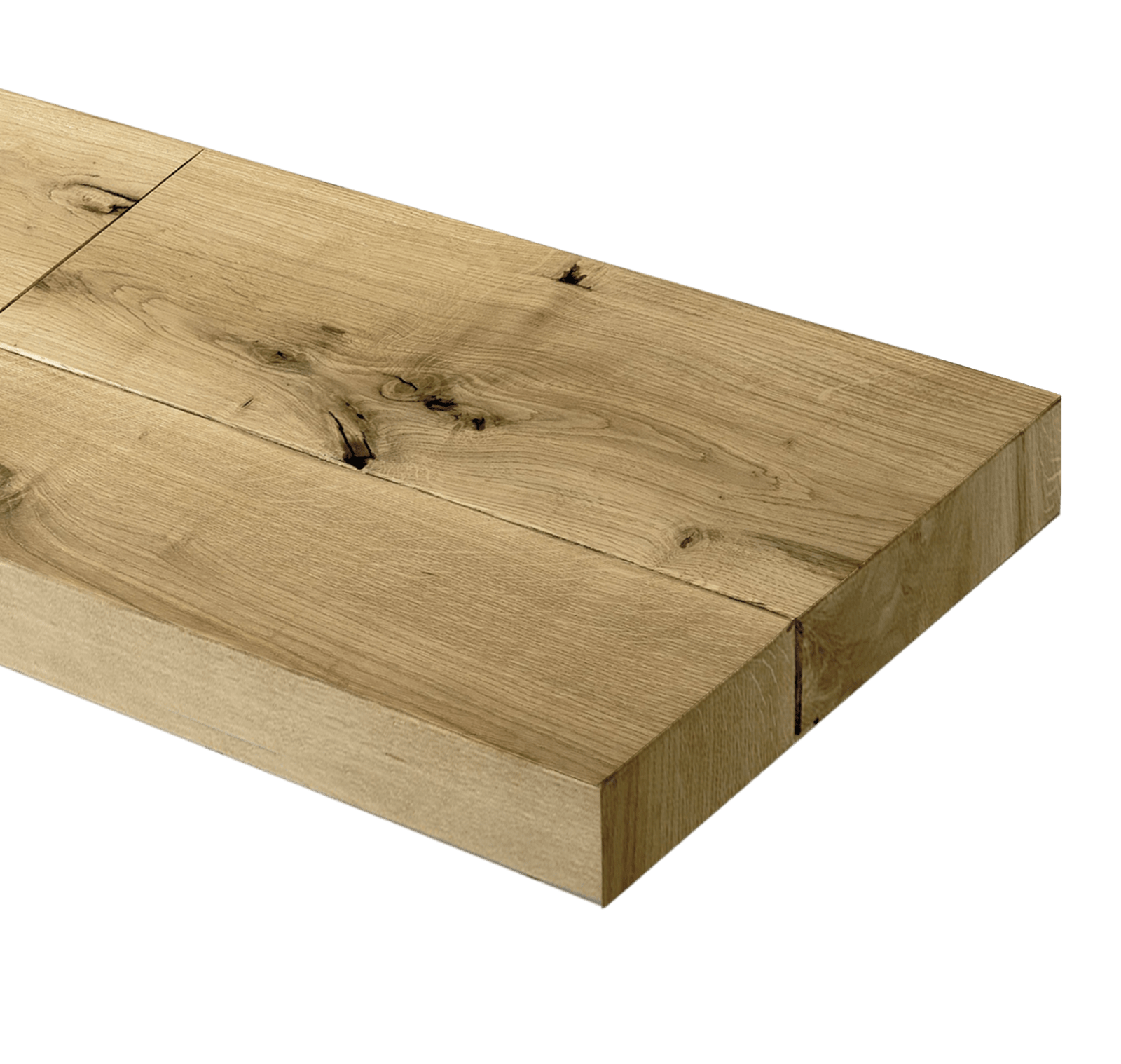 64-mm thick tops on a laminboard or plywood support, covered on the surface and edges with plastered, plank-effect durmast wood folder on the front, rear, and perimeter. Both the natural shape of the tree trunk and its natural colour variations are preserved. Water based vinyl adhesives or two-component acryl coat.