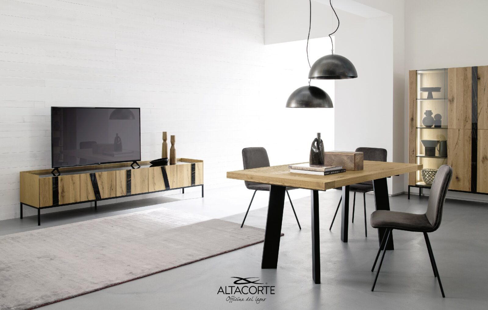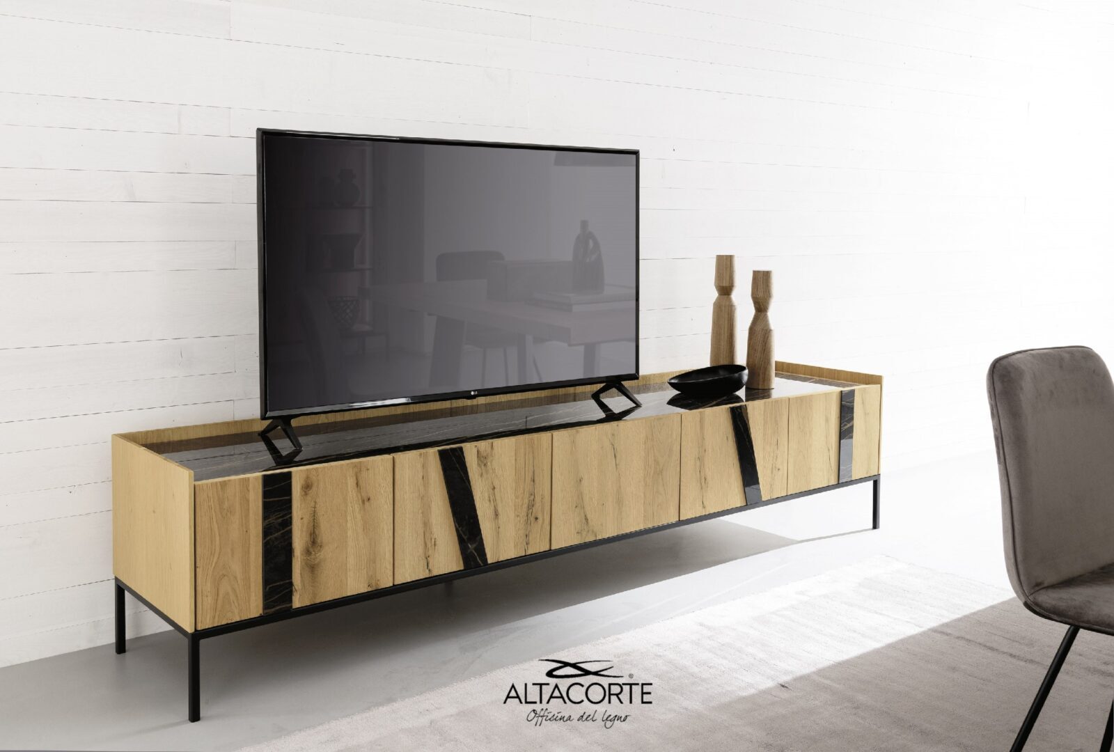 A Tv cabinet of strong impact for your guests. Customizable with more than 500 different combinations between cabinets, doors, legs, inserts and tops: in this way each sideboard will be different from all the others. How would you make it?