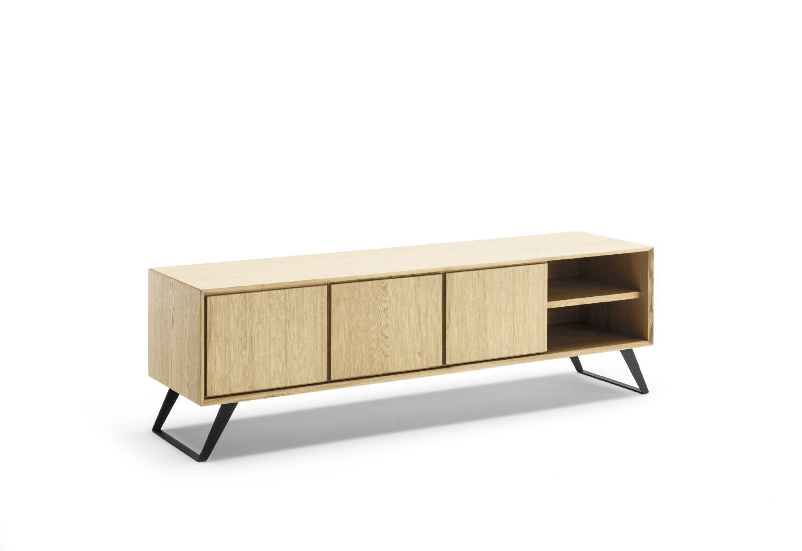 Tv-cabinet entirely realized in durmast or walnut wood with brushed external surface. Vinyl adhesives and water-based ureic resins comply with the UNI-EEC regulations. Water based vinyl adhesives or two-component acryl coat. Solid durmast wood table base or in epoxy-painted or acrylic-finish oxidised steel.