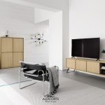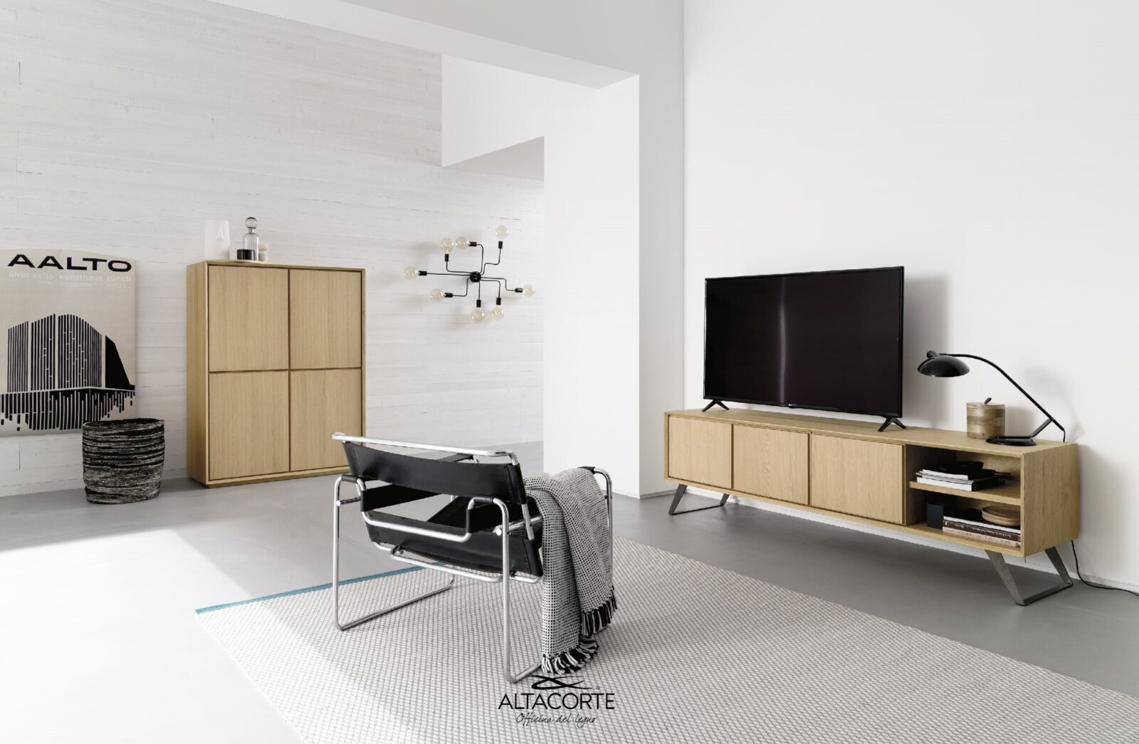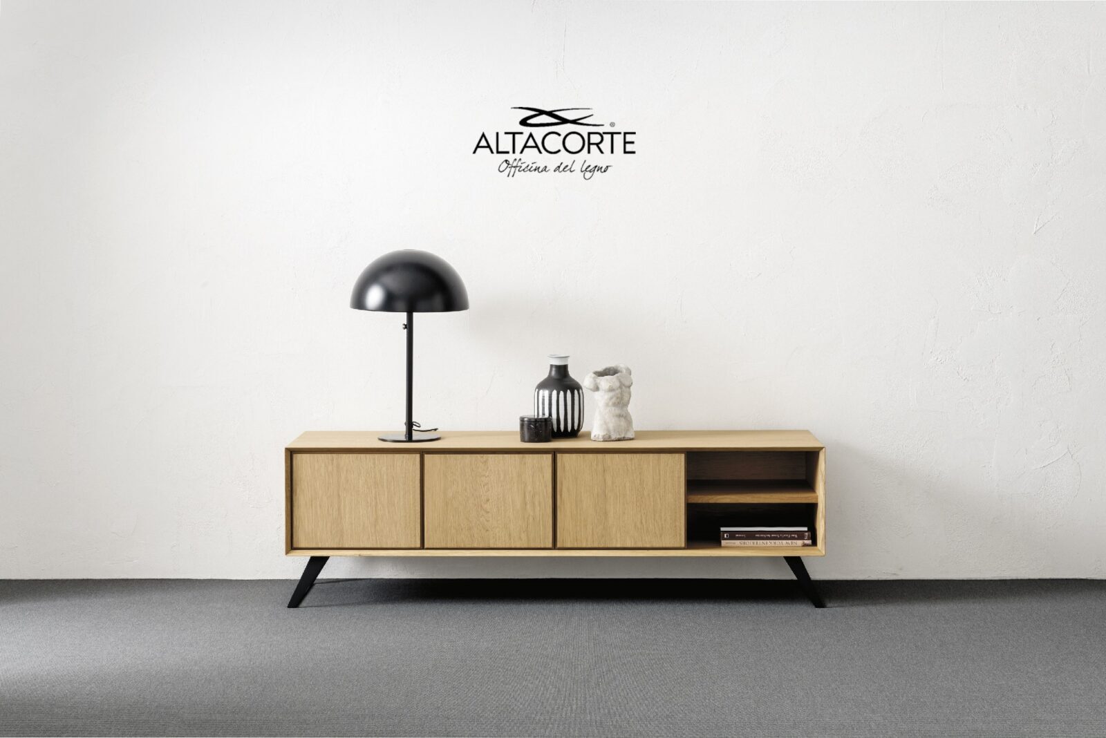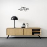 A classic of the Altacorte style. A TV-cabinet with cabinet entirely realized in durmast or walnut wood, created by skilled hands of expert artisans. An essential design, but never trivial, which could be further enriched by the peculiar cement doors.