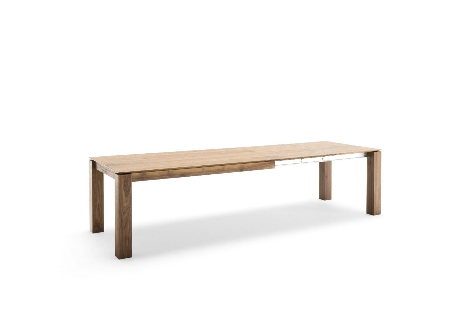 Walnut variation: the structure is in solid wood covered with Canaletto walnut folder, the legs are 120×120 mm, the 25-mm thick plywood or laminboard top is covered with Canaletto walnut wood folder on two sides and framed along the perimeter with solid Canaletto walnut. Planed top. Water based vinyl adhesives or two-component acryl coat. Aluminium alloy telescopic runners fitted on ball bearings.