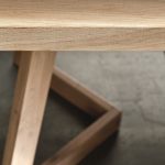 Solid wood legs that can be combined with solid European durmast or Canaletto walnut wood tabletops 40/45-mm thick with folder on plywood, solid European durmast wood tabletops 55/60 mm thick, tabletops 64-mm thick with laminboard or plywood support with smooth or plank-effect durmast wood folder on the front, rear, and perimeter. Water based vinyl adhesives or two-component acryl coat.