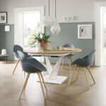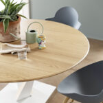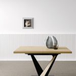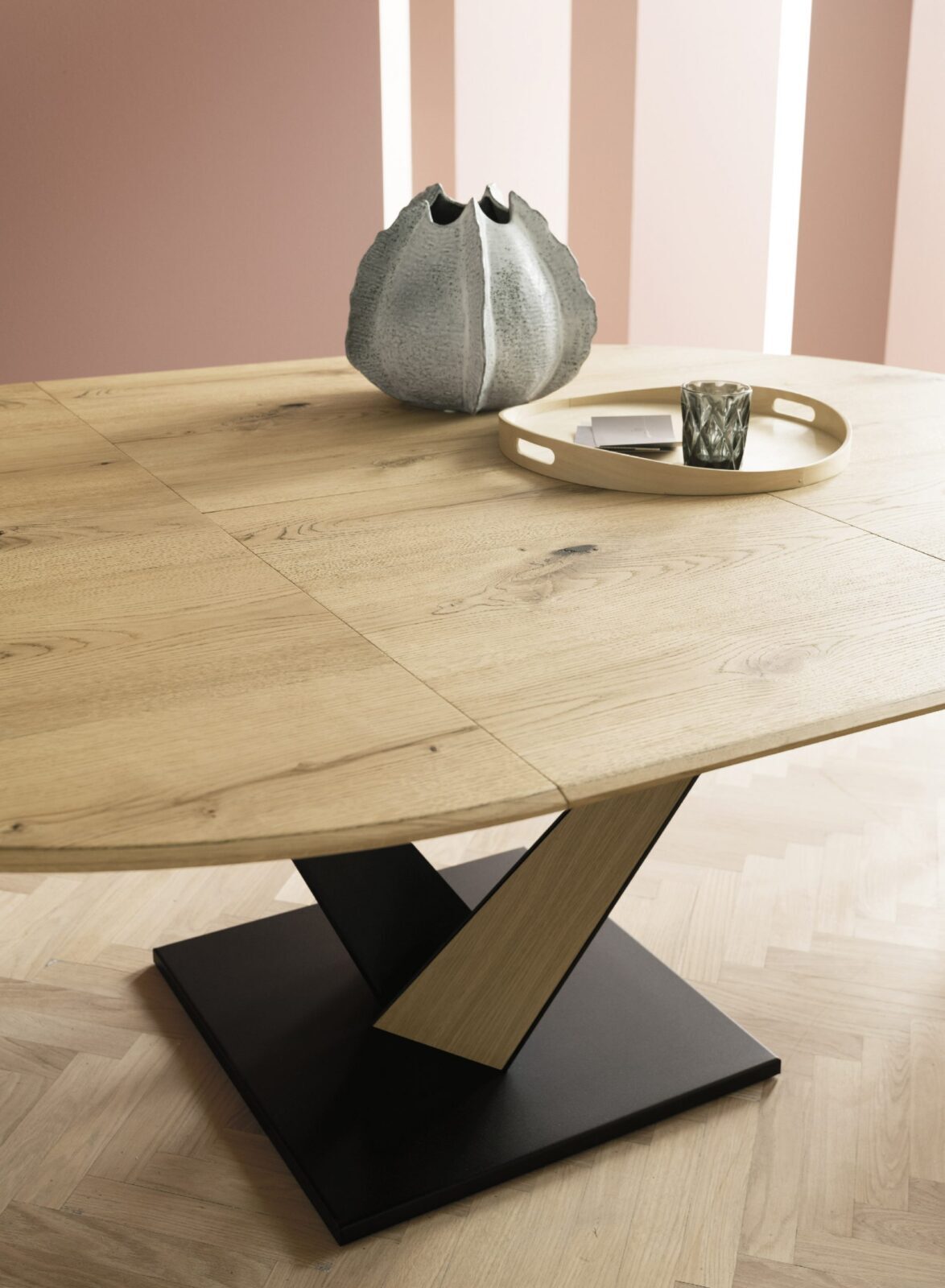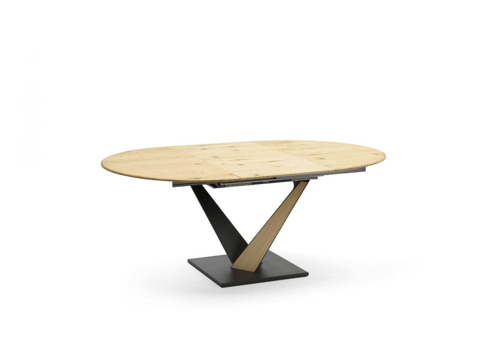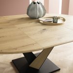Steel table base that can be combined with round tops 20-mm thick or square tops 20/40-mm thick, on laminboard support with durmast wood folder on two sides and framed along the perimeter with solid durmast wood. Available also the Canaletto walnut wood variation. Water based vinyl adhesives or two-component acryl coat. Finally, available with a 12 mm thick top (6 mm ceramic + 6 mm glass) with a 600 mm extension.
