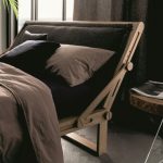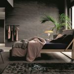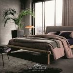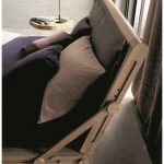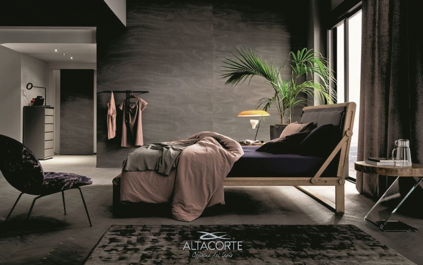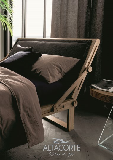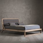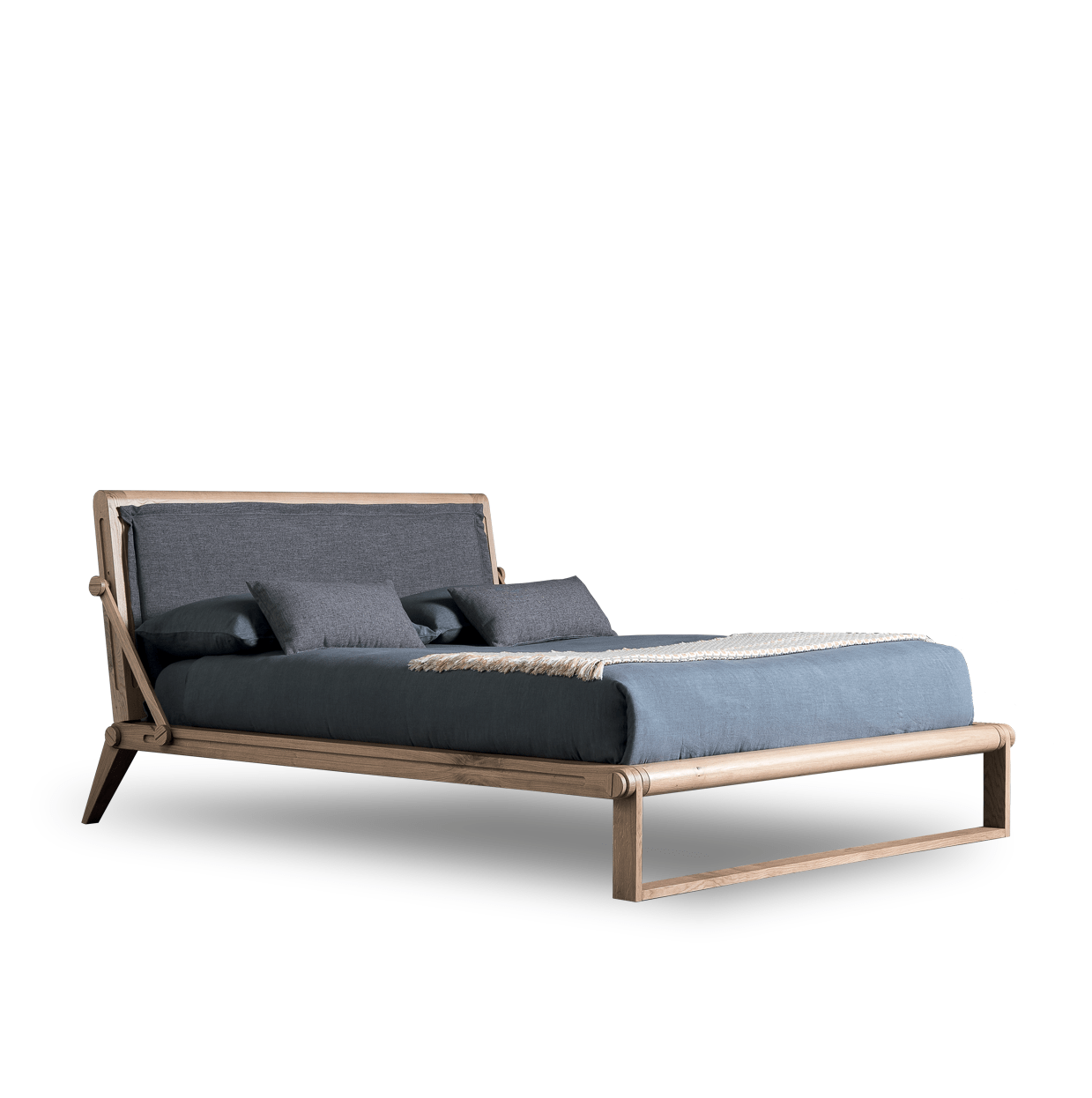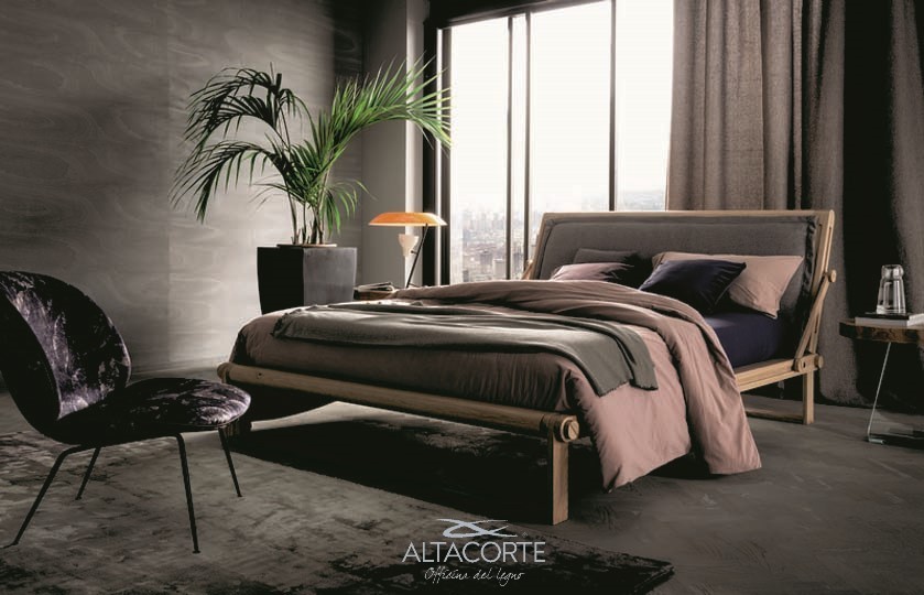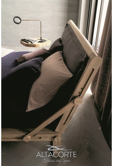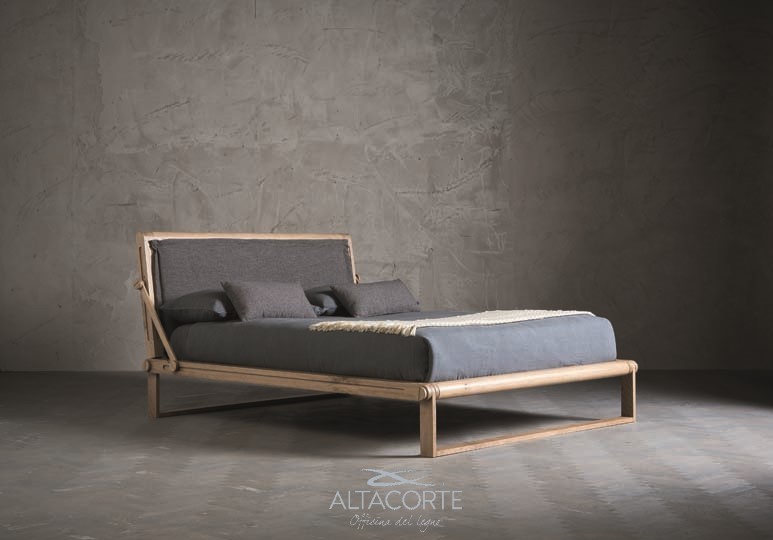 A bed with a modern design with ergonomic function thanks to the headboard which is adjustable in many different positions for the absolute comfort lovers. The structure of the of the headboard, side rails and footboard made of solid European oak wood with wood inserts machined from a solid. The headboard is available in wood with engravings or padded with non-removable fabric, leather, or eco-leather. The leather version has three vertical seams.