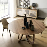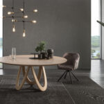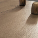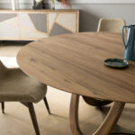 Tops in 40 mm thick solid oak with brushed surface or in solid canaletto walnut. Base consisting of a connecting element in powder-coated or oxidized steel with acrylic finish. Legs in shaped solid oak or walnut.